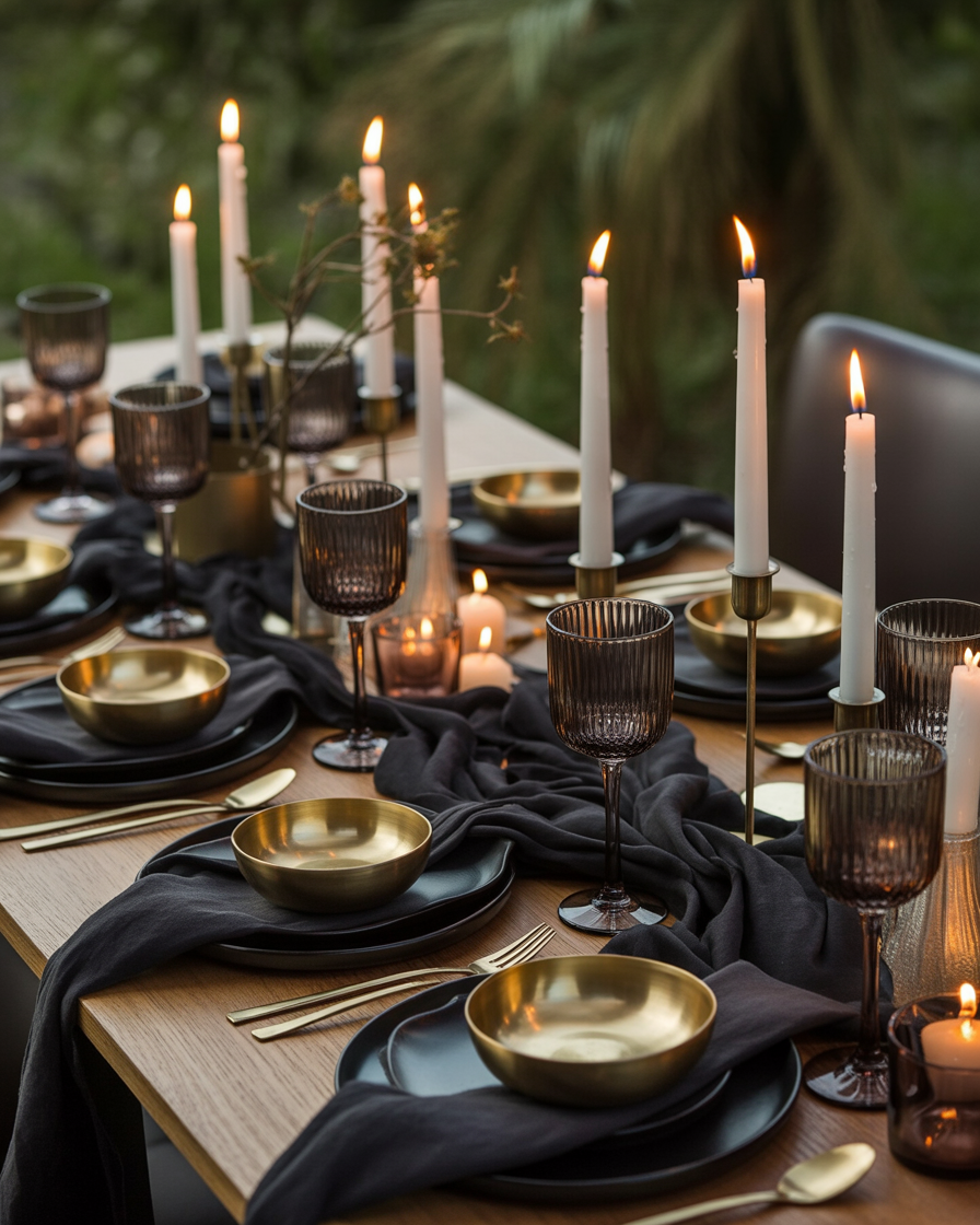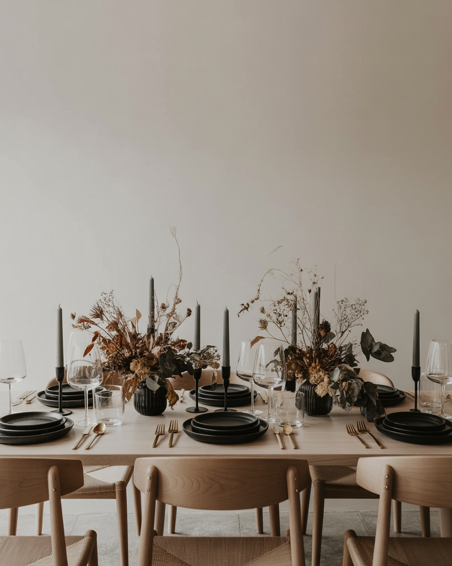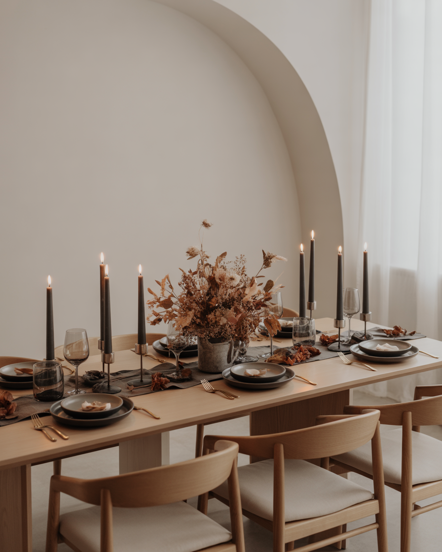 A moody, neutral color palette sets a chic and serene atmosphere for fall gatherings. Imagine charcoals and taupes, soft browns, matte blacks and combine with natural textures. This aesthetic looks fabulous on long tables or circular tables, mostly in modern or minimalist households. With centerpieces, keep it simple autumn the unfussy black taper candles, undressed raw linen runners, and simple dark ceramic vases with eucalyptus or dried florals. It’s effortless elegance with a quiet edge.