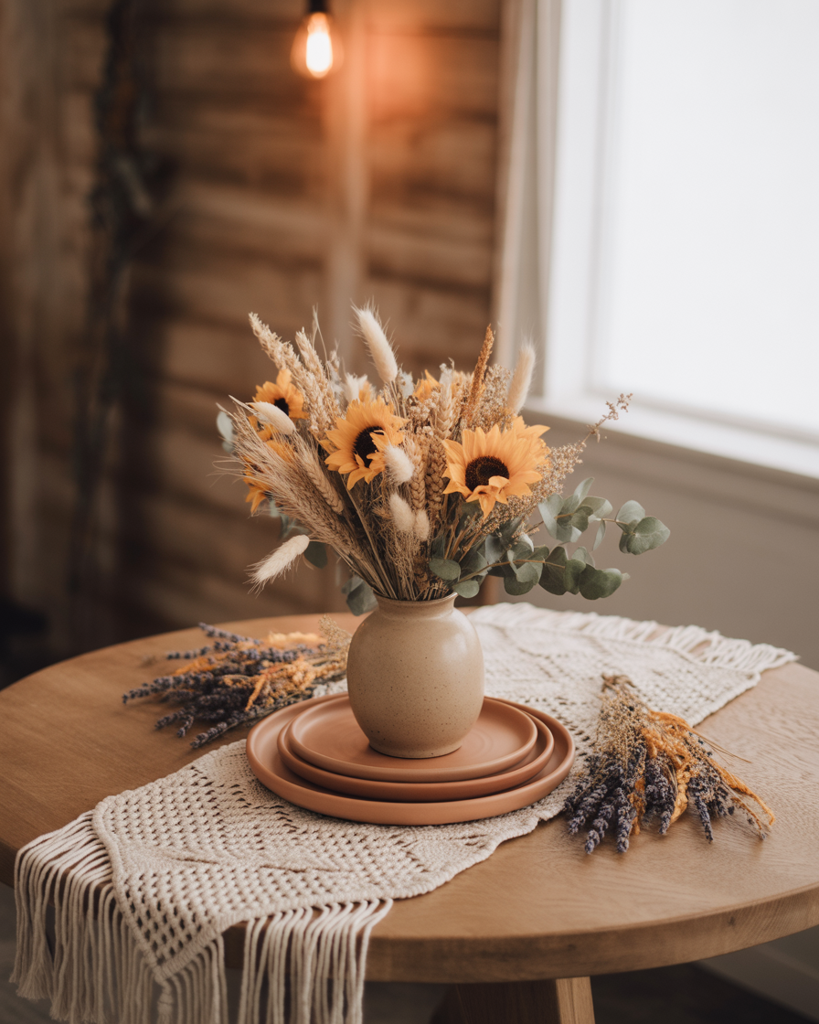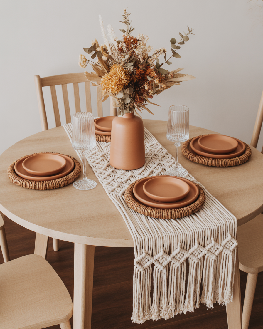 Boho fall table decor brings effortless charm using tactile, grounded materials. Combine layer neutral macrame runners with a terracotta plate and add some dried flowers as pampas grass and wheat so that it looks like soft movements. Keep centerpieces uncomplicated such as hand made ceramic vases or bowls with foraged branches. This look works beautifully on round tables for intimate dinners or living room gatherings and has become a favorite in ideas for the cozy, laid-back decorator.