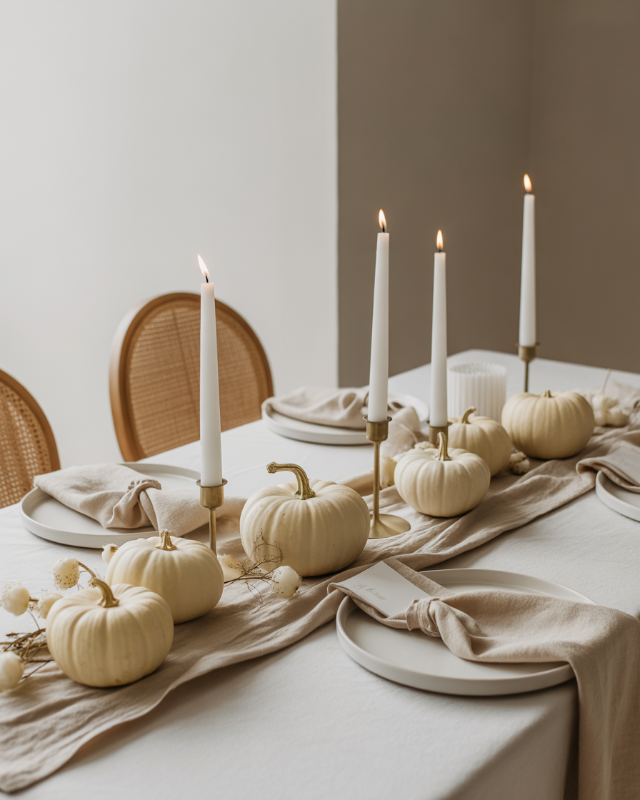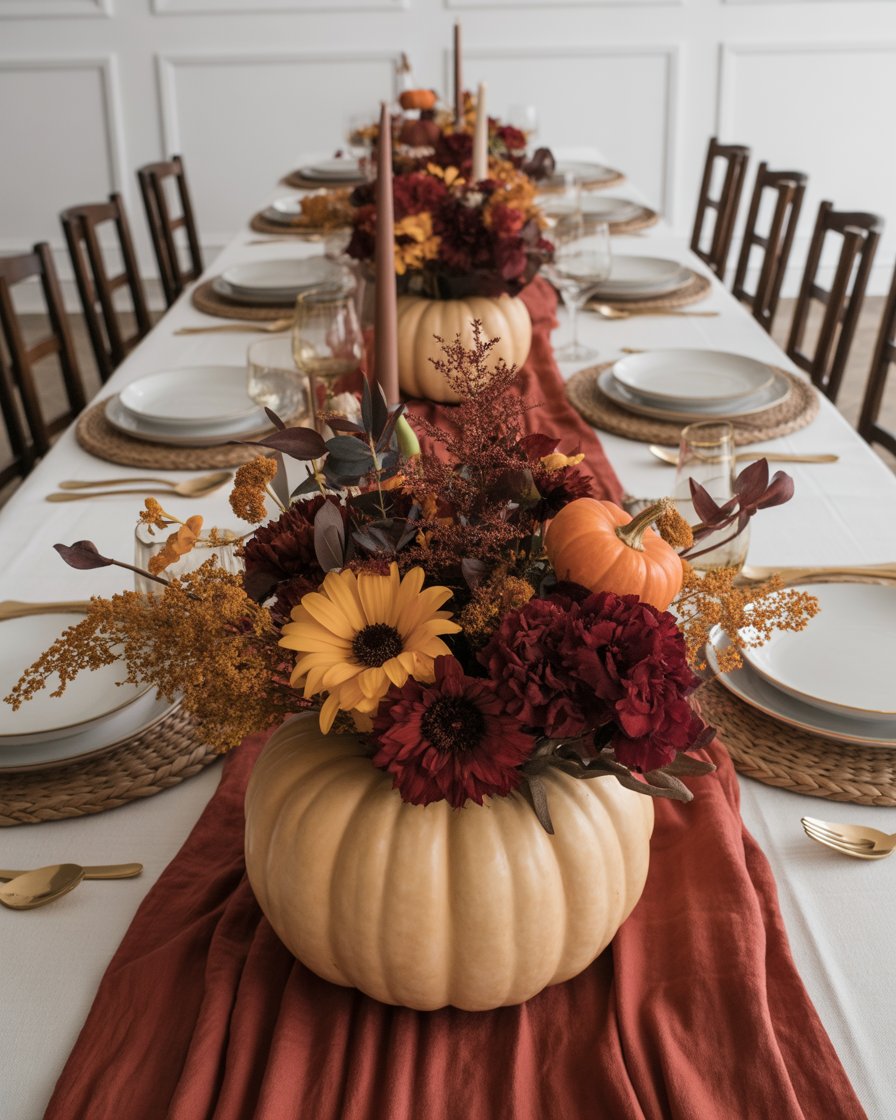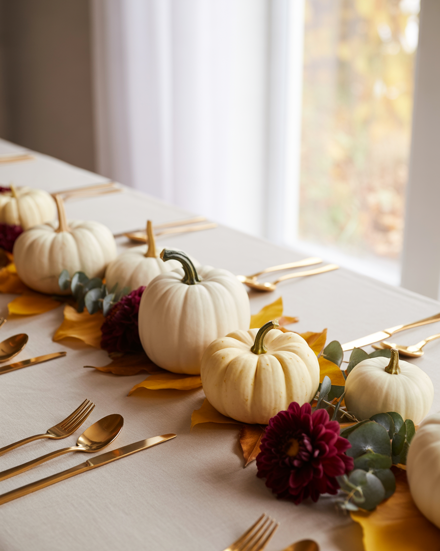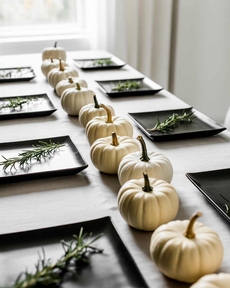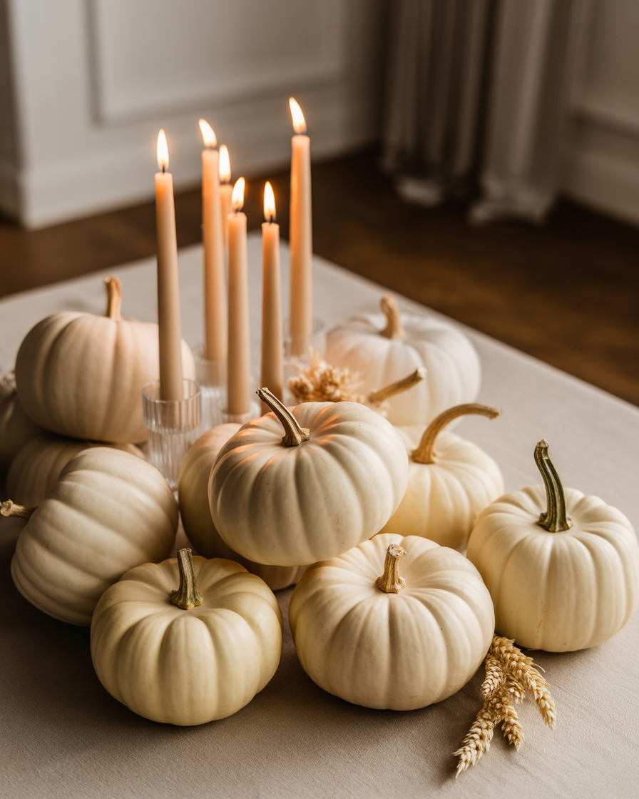 Go all-in on white pumpkins for a simple, elegant, and timeless design. Use them in different sizes, on top of one another or laid out on a linen runner. Combine with ivory candles, white dishes, and beige napkins to have a neat look. This look suits modern homes or minimalist wedding tables with a neutral color scheme.