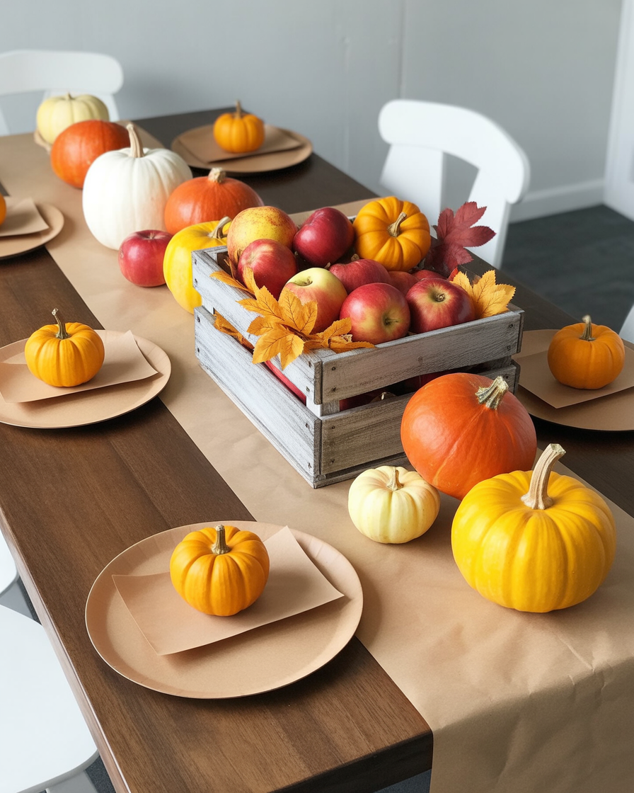 Planning a party or family-style Thanksgiving? Make a dedicated kids table with bright pumpkins, kraft paper runners that they can doodle on and mini diy treats. Decorate with fun centerpieces such as a crate painted and filled with apples and leaves and tie their names to mini pumpkins as place cards. Keep it easy and interactive—this is one of the most practical fall decorations for party that’s also fun.