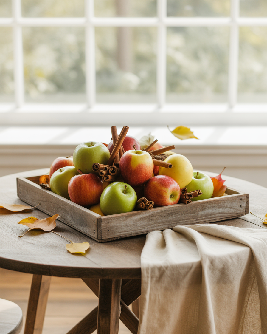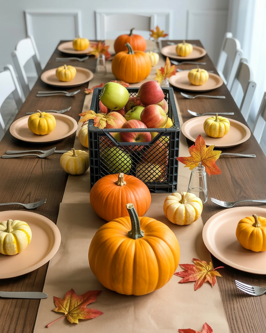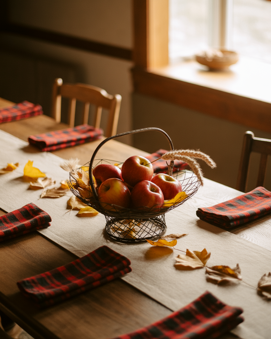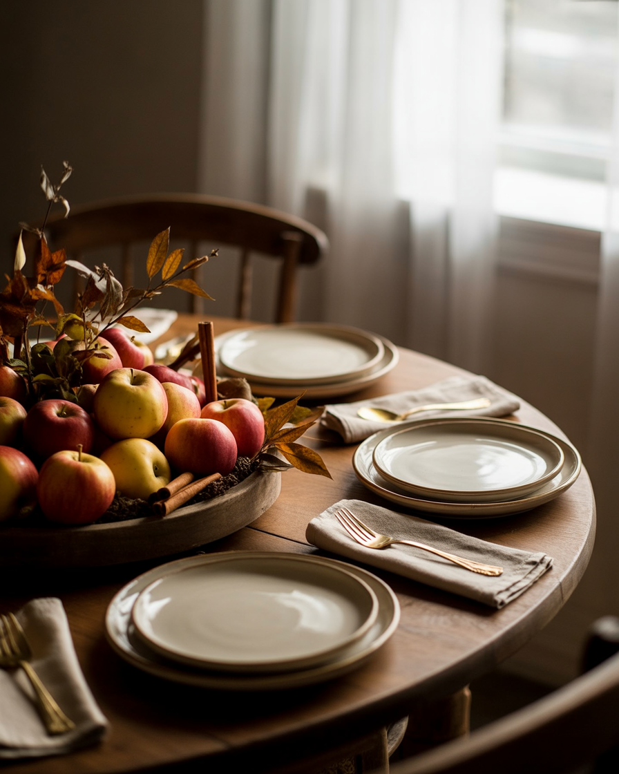 Don’t underestimate the charm of apples. Using wooden trays or tiered stands as your centerpiece items, place red or green apples in whatever may suit you and color. Complete the picture with cinnamon sticks, bay leaves, and linen napkins. This is a simple inexpensive way of sharing the season. It shines on round tables in the kitchen or living room and is popular among fans of farmhouse style.