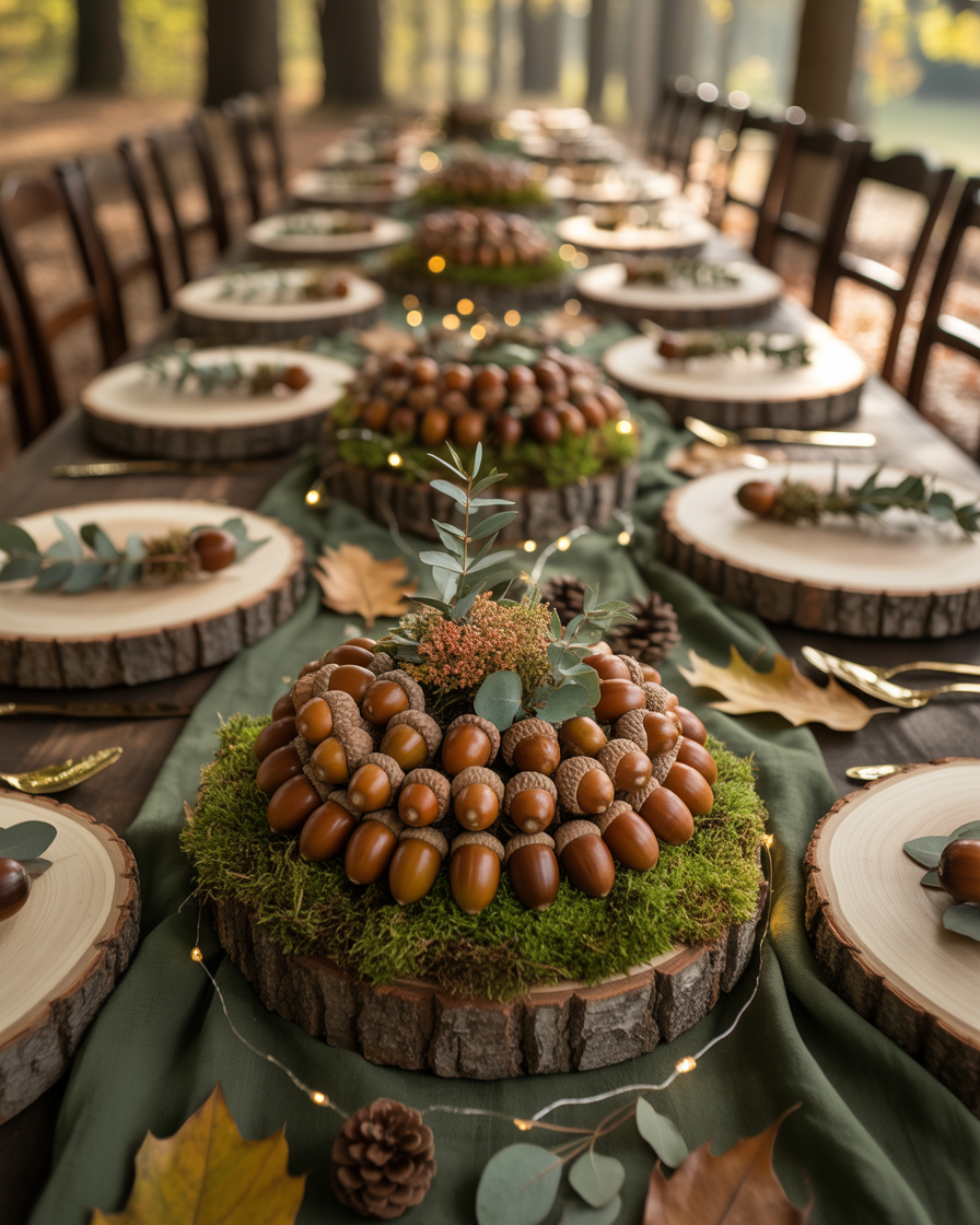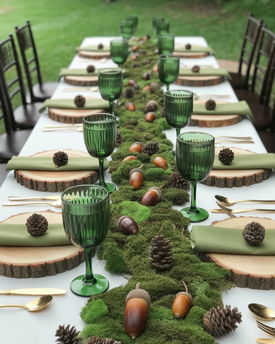 Inspired by the woods? Include such details as moss, slices of fruit wood to act as a charger, pinecone, and artificial antlers. Combine them with dark green linen and dull brown napkins. Add centerpieces easy autumn such as wooden bowl stuffed full of acorns and ferns. This rustic look is perfect for long tables in cabins, outdoor venues, or woodland-themed weddings.