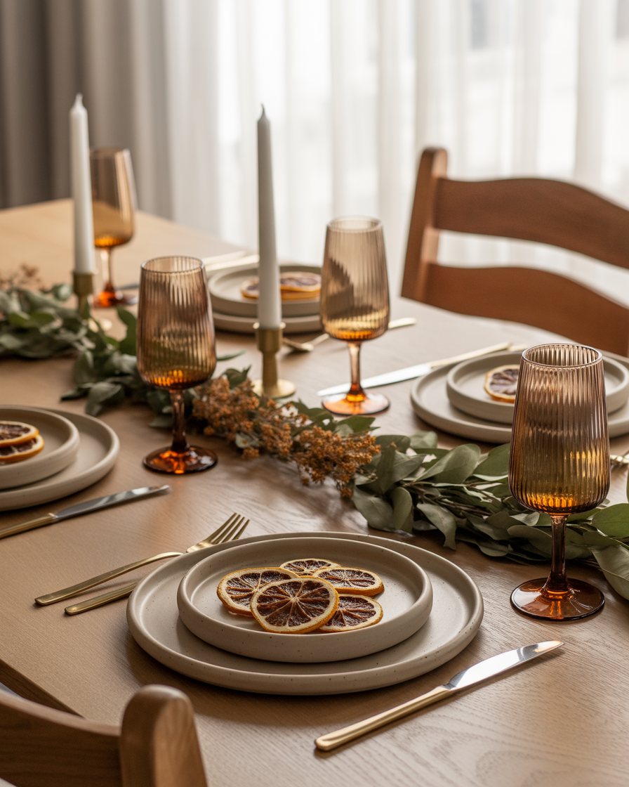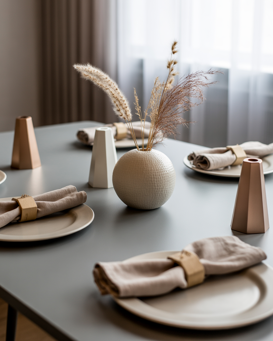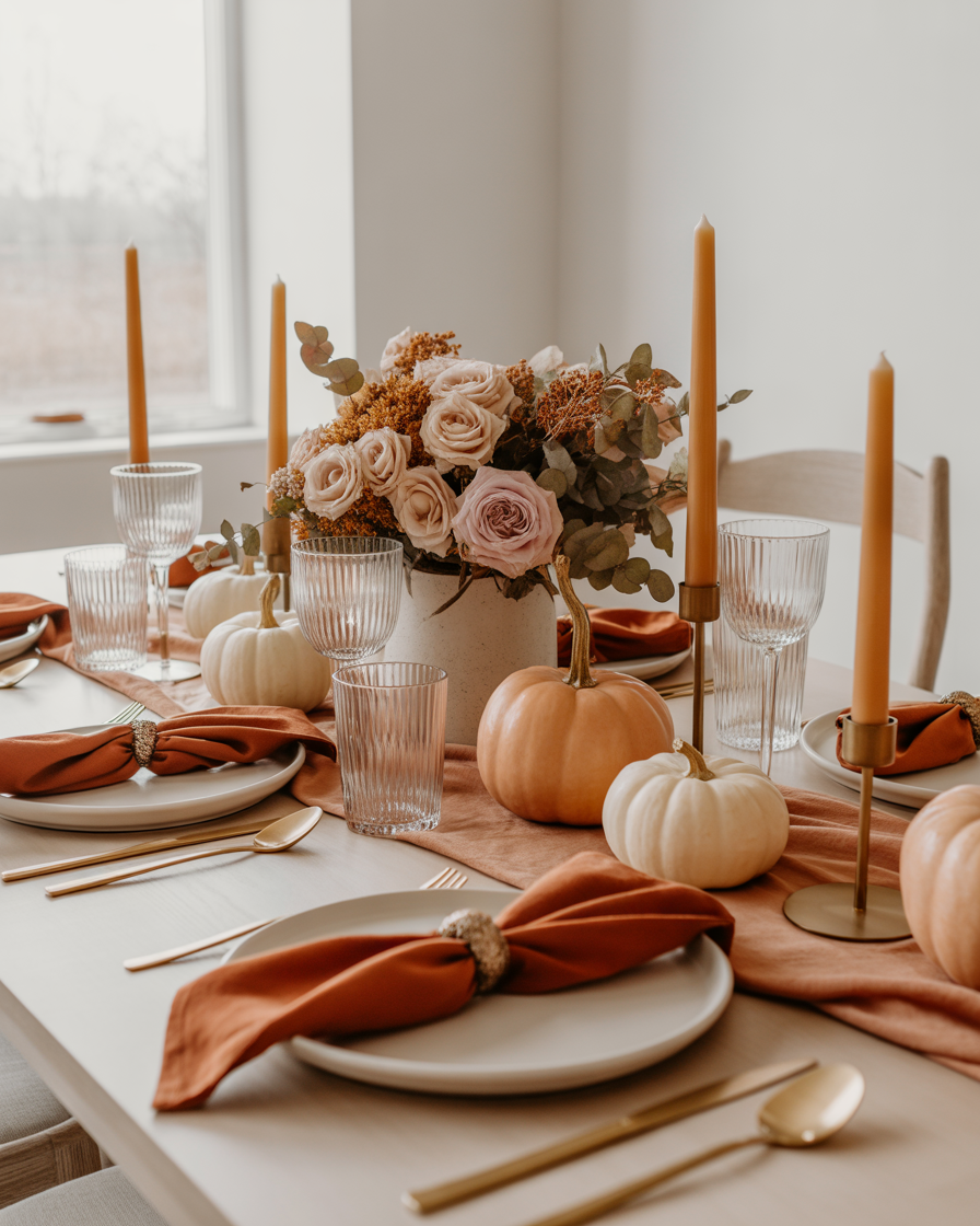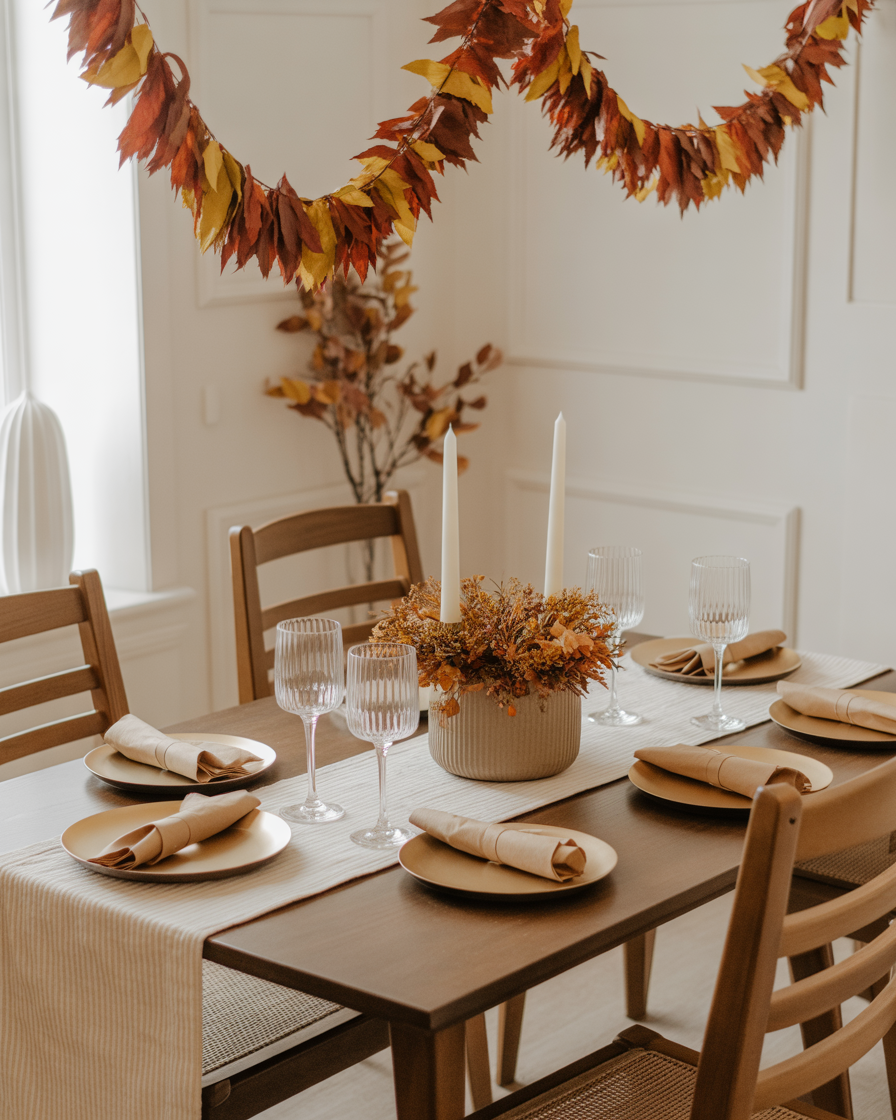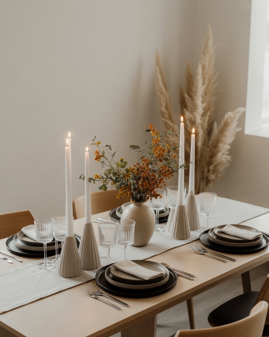 For a fresh take, blend modern geometry with autumn tones. Serve with angular candle holders, square placemat, and ceramic centerpieces (indeed clean) design. Stick to a neutral color palette go (stone gray, sand, off-white) and make the shape take the lead in the looking. This works great in urban apartments or dining room settings with a clean design ethos.