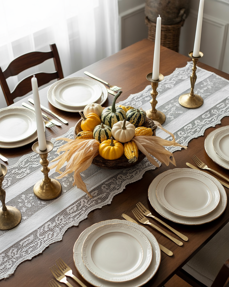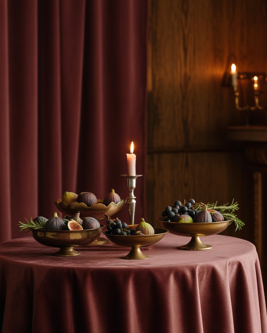 Layer luxury with rich fabrics like velvet runners and napkins. Combine rich colors–burgundy or navy or forest green–with candles of different heights flickering. Use centerpieces that are simple in nature like low brass bowls with dried petals or grapes. This moody vibe is perfect for dramatic Thanksgiving dinners or evening party tables.