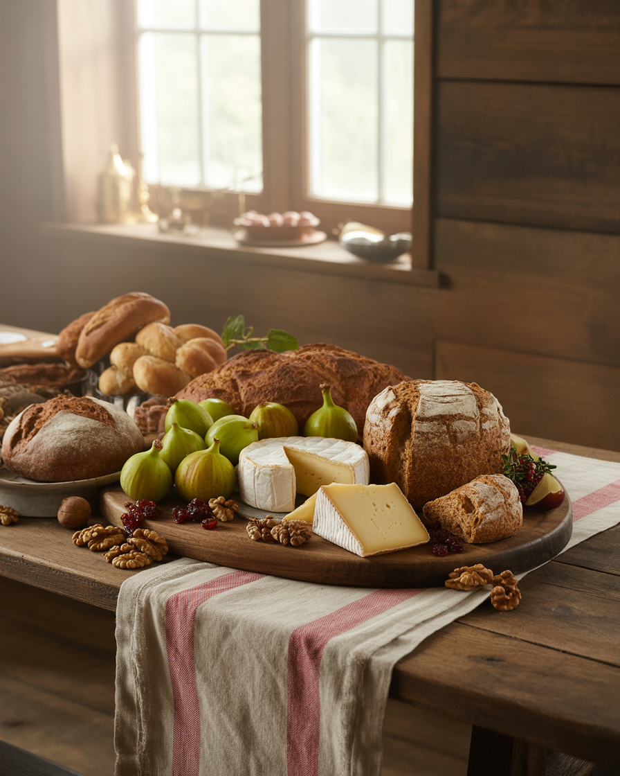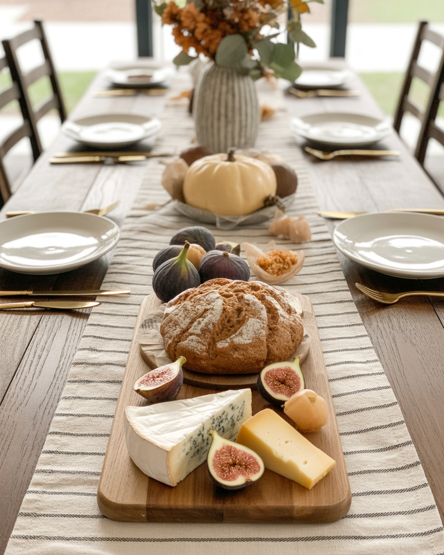 Trade traditional centerpieces for a wooden bread board overflowing with rustic baked goods—breads, figs, cheeses, and seasonal fruits. It acts as both décor and appetizer. Mix in a striped linen runner and copper mugs. This is perfect for long tables in farmhouse kitchens or for a casual wedding welcome dinner.