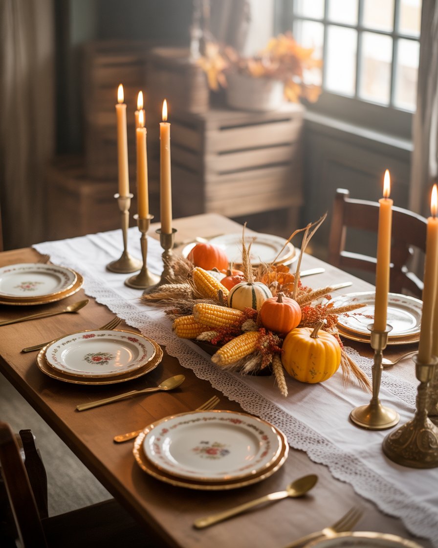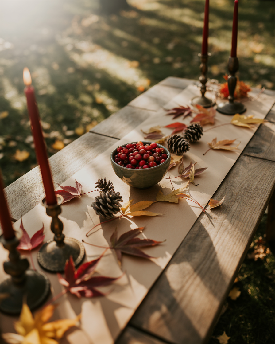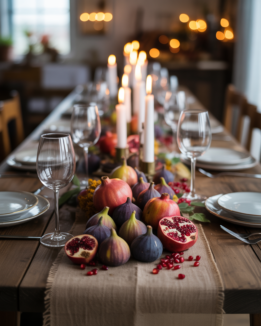 Create a warm, rustic ambiance with rows of mismatched candle holders, old wine bottles as vases, and burlap runners. Add some seasonable fruits such as figs and pomegranates to add color. This look is ideal for long tables in barn venues or Thanksgiving dinners at home where soft lighting and texture matter most.