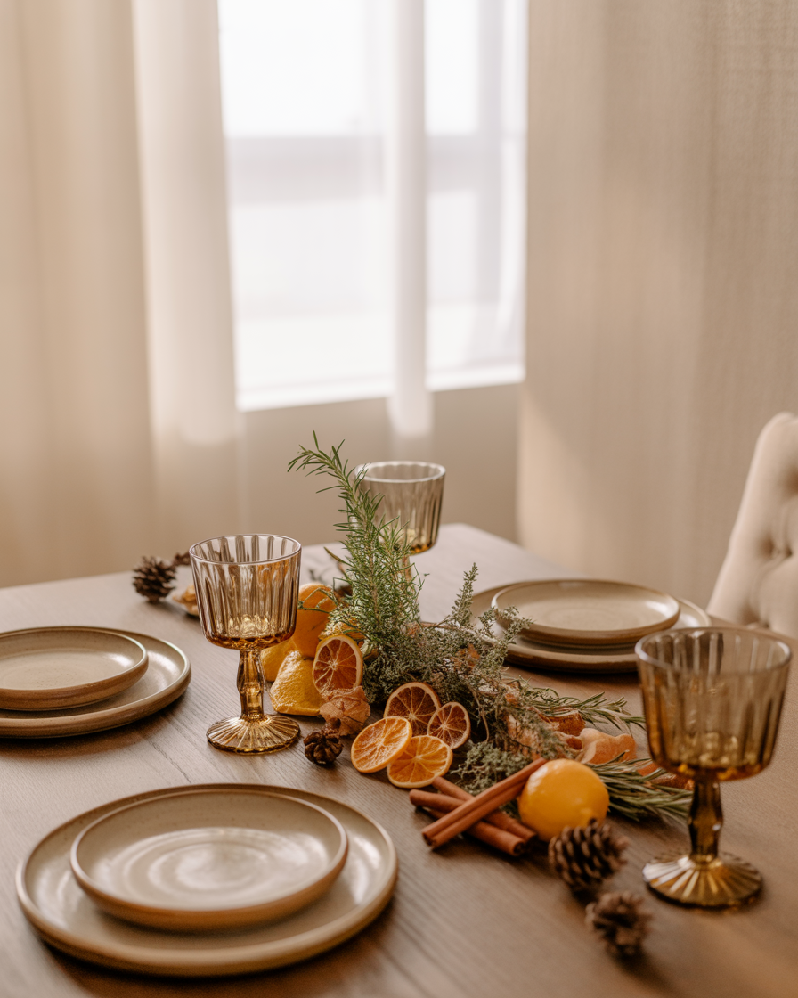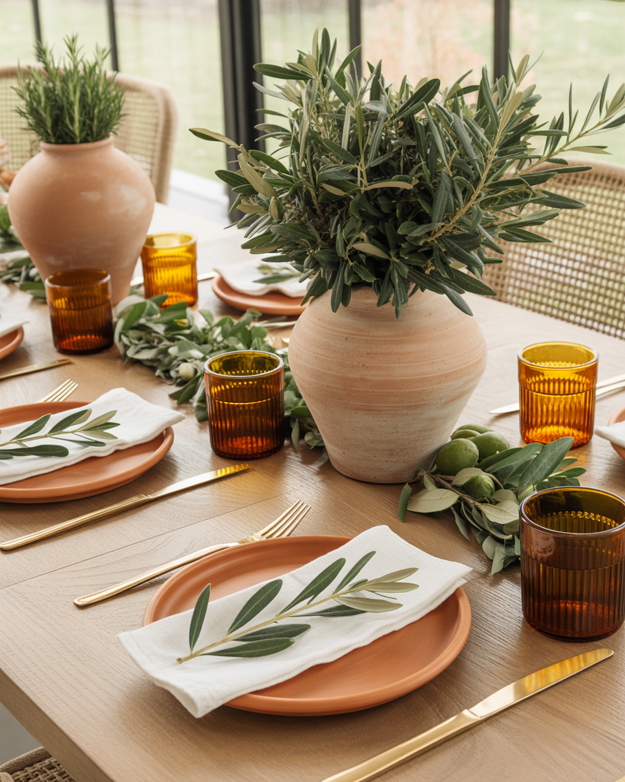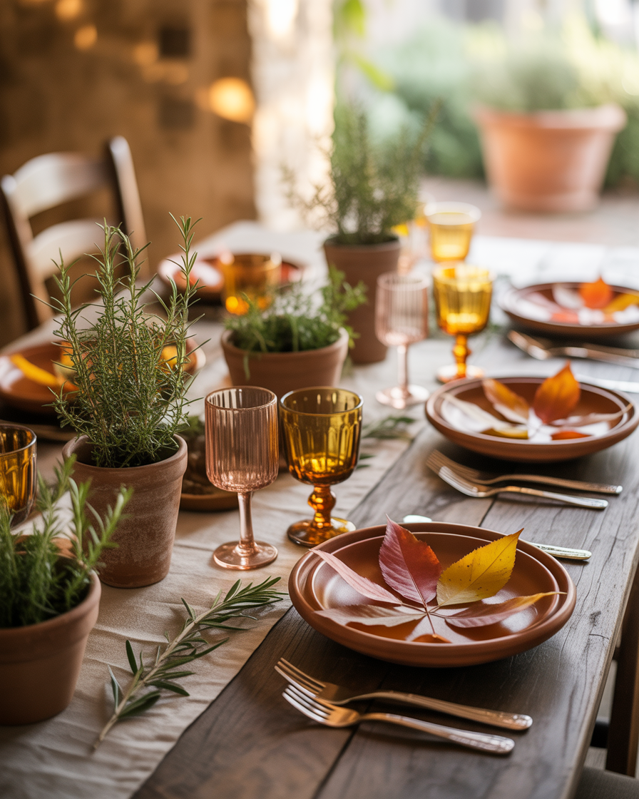 Channel Mediterranean warmth with terra cotta plates, olive branches, and amber glass accents. An easy fall accessory is clay pots with herbs such as rosemary or sage which can be used as a centerpiece. This look fits beautifully in both rustic and modern interiors, especially in homes that blend farmhouse and global styles.