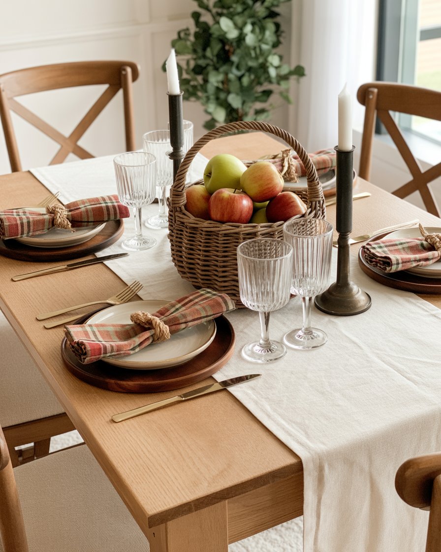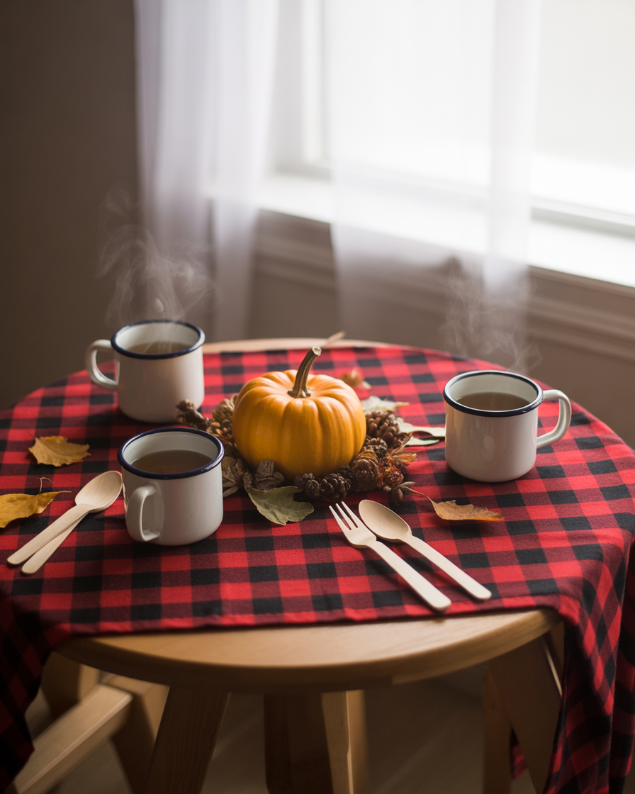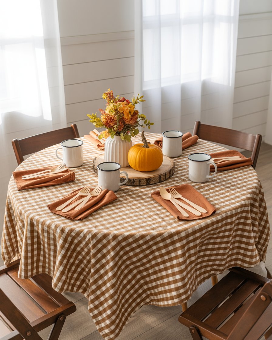 Bring that crisp autumn picnic feel inside by layering a flannel blanket or tablecloth in rich seasonal colors—like navy, rust, and mustard. Include enamel mugs and wood utensils and centerpieces of stacked mini pumpkins or plaid-wrapped jars with wildflowers. This cozy, easy idea works well on round tables for a relaxed evening in the living room or as part of decorations for party setups.
