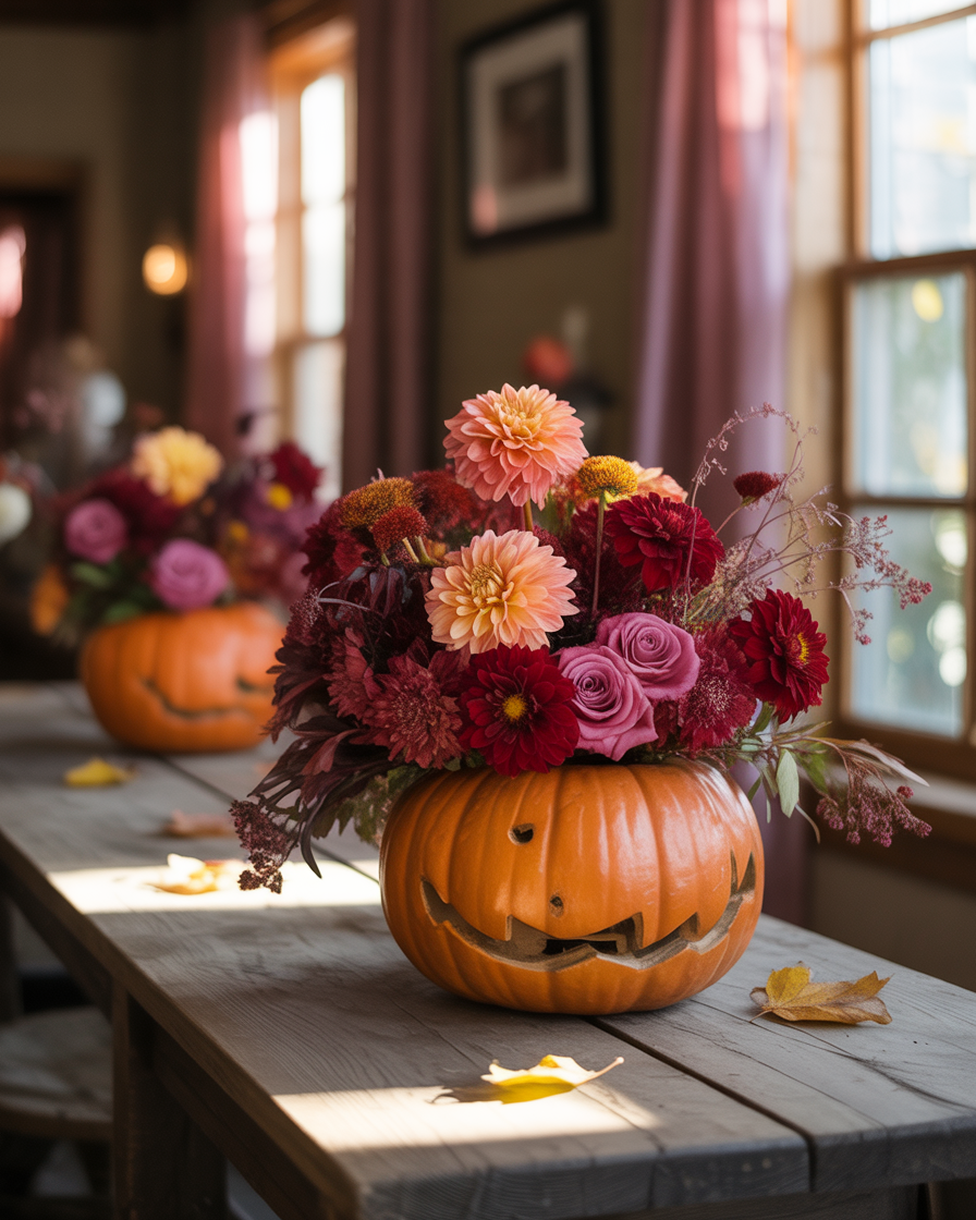 Step up your centerpieces game with bold, overflowing floral arrangements in deep oranges, burgundy, and rust. Mix greenness and wild branches with dahlias, marigolds and chrysanthemums. Place them in oversized vases or even hollowed pumpkins. This look is striking on long tables, especially for wedding receptions or decorations for party events where you want drama and beauty.