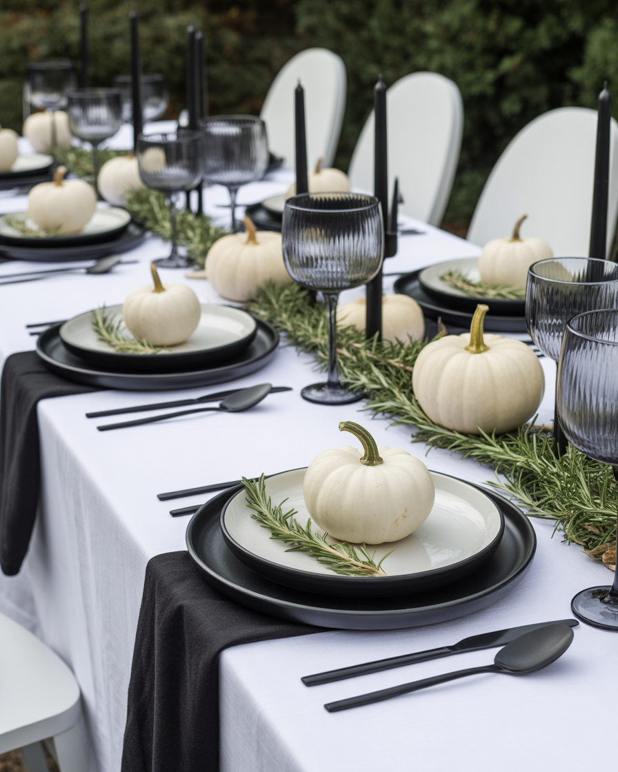 A modern black and white palette is unexpected for fall but stunning in execution. Take transparent white linens combined with matte black dishes or vice versa. Accent with minimal white pumpkins and black candlesticks. It is also one of the greatest concepts that dining room decorators adore in luxury houses. Add a sprig of rosemary or sage at each setting for a subtle seasonal nod.
