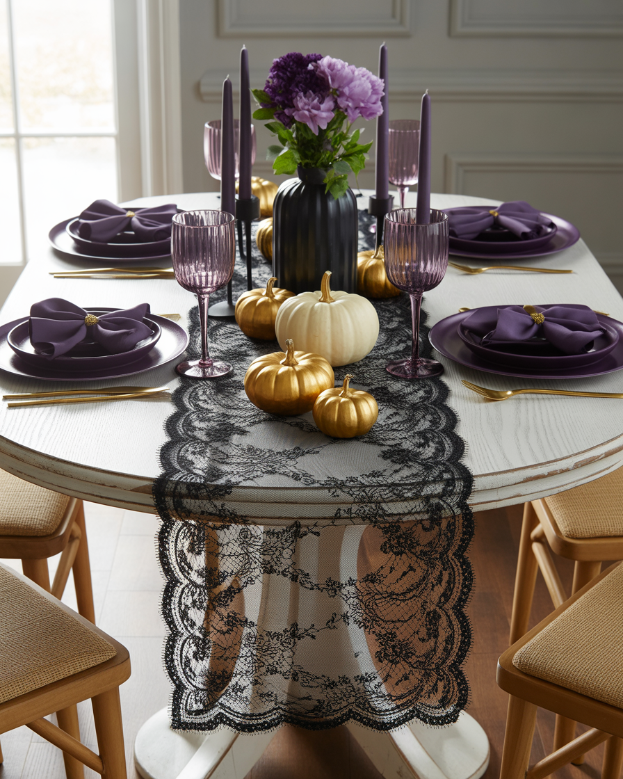 Combine spooky with sophistication. Choose to do black lace runners, smoky glassware, dark purple florals, and mini-white pumpkins painted with metallic gold. This is one of those Halloween dinner party ideas, that is upbeat not cutesy. Set this up on a round table in your living room for an intimate, moody evening.
