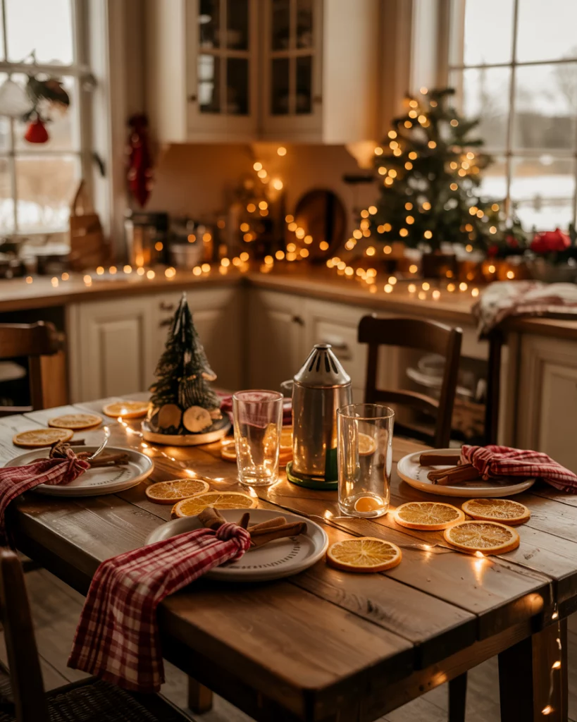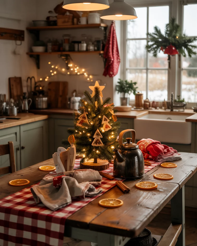 There is no farmhouse Christmas like a vintage red-whites color scheme in the kitchen. Change your standard dish towels, mugs and curtains with check or striped ones, in festive colors. Put up diy garlands of dried orange slices and cinnamon sticks, and think of a small tree with cookie cutters on your counter. It is one of such concepts diy kitchen projects that smells almost as good as it is appealing; warm, fragrant, and full of class.