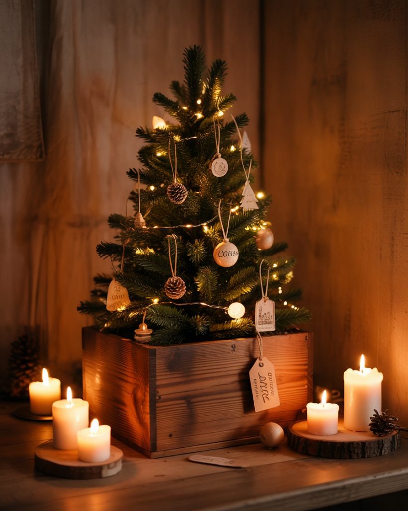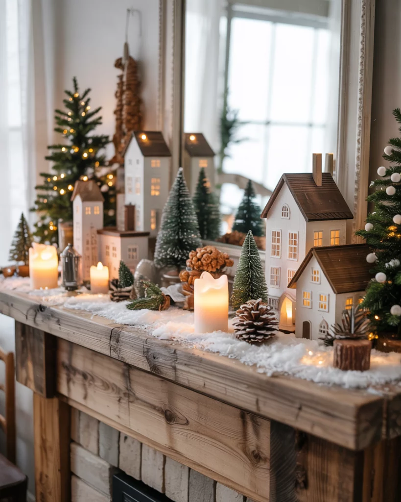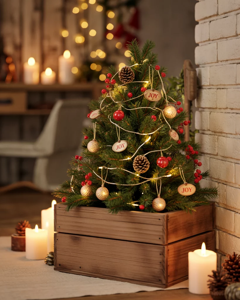 In case you have little space or just want a diy twist, pile up old rustic wooden crates into a tree-shaped design. Ornament the shelves with candles, pinecones ornaments or even little village houses. It is a cheap but beautiful way to bring some holiday flavor to small areas such as apartments, corners of a kitchen or reading nooks.