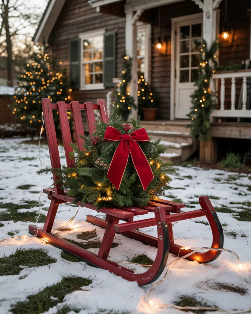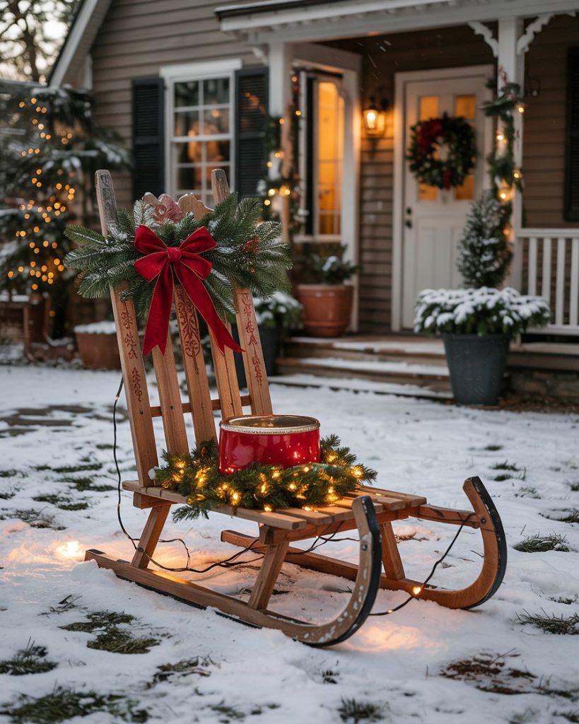 Settling an aged sled against your wall is an ancient country cabin trick. Bow it up with some big red bow, greenery or string lights. To make it more textured add a bunch of mittens or logs underneath. This is an ideal one to use on front porches or doorways, and mixes nostalgia of winter with seasonal pizzazz.
