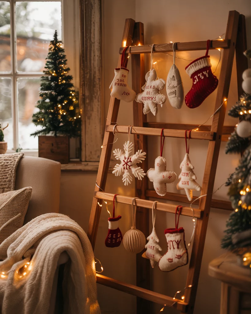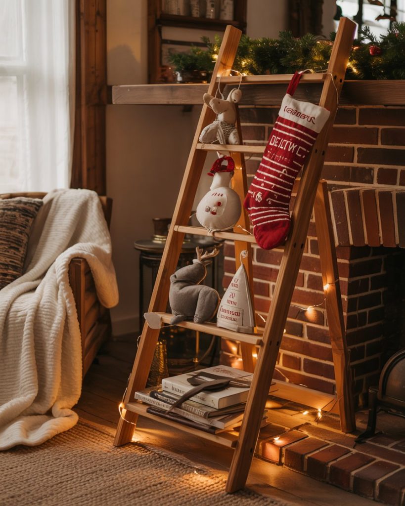 Hang a battered wooden ladder on the wall to display stockings, mini wreaths or diy decorations. It is perfect to fit corners in the living or the kitchen. Toss fairy lights or ribbon to the sides to provide glitz. This brings vertical interest and rustic appeal and leaves floor space unoccupied.