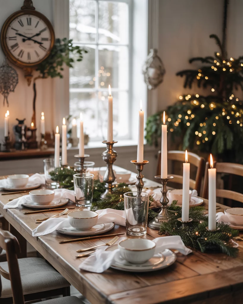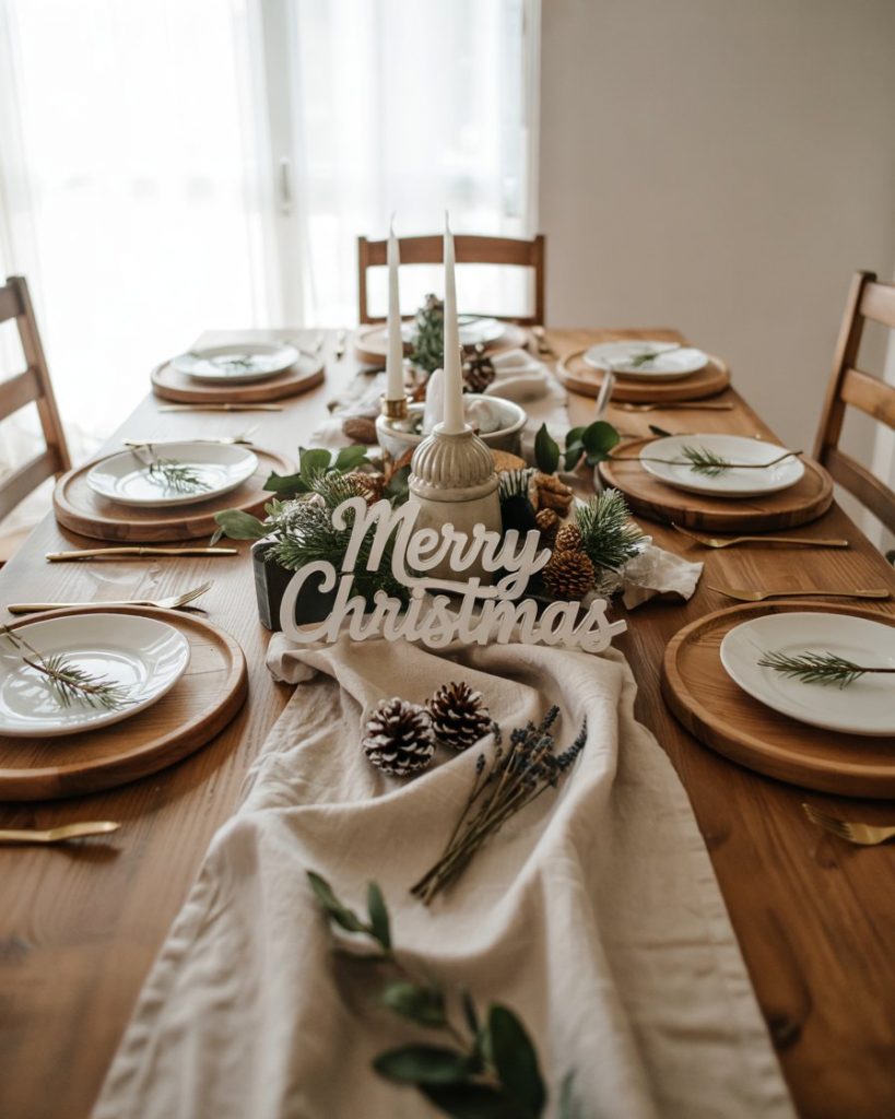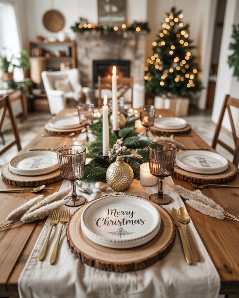 Mix boho with the farmhouse feel with a simple and earthy holiday table. Use neutral ceramics, wooden chargers and linen runners. Ornament with artificially dried flowers and candles in brass candelabra. It is a quiet location that is ideal in hosting small dinners as well as celebratory meals.