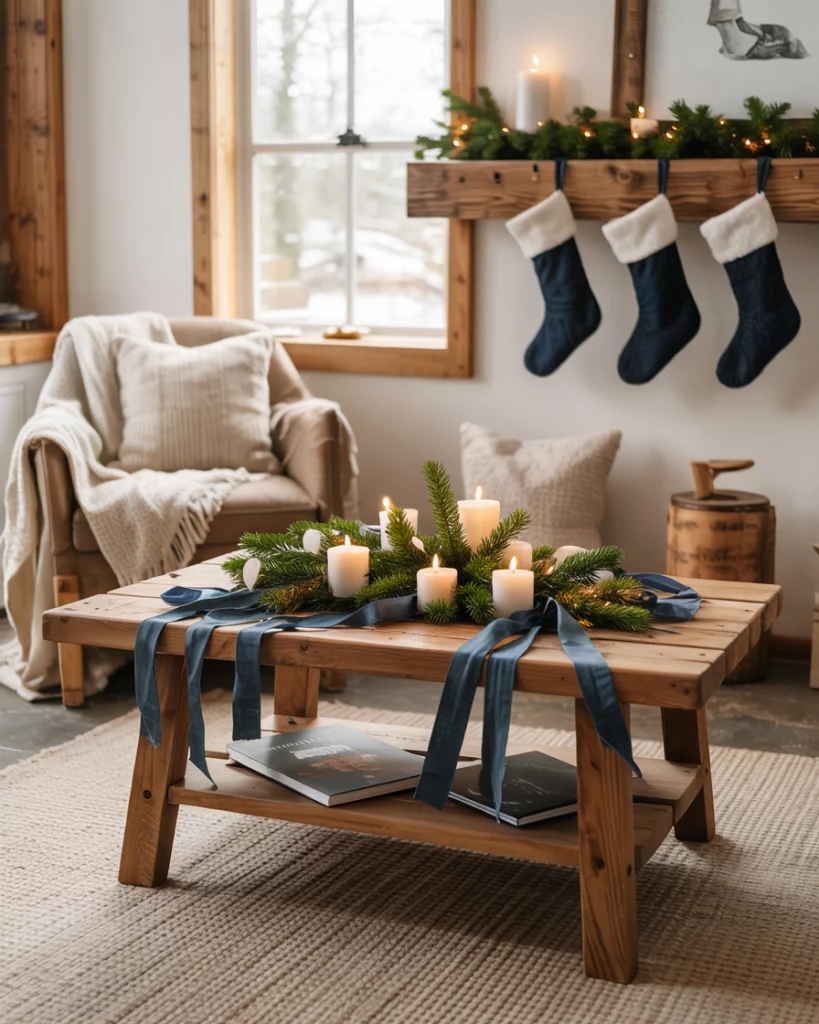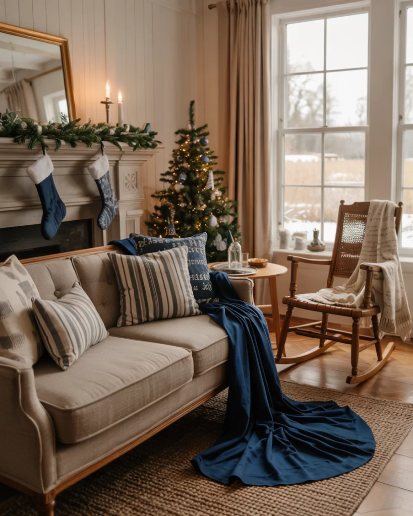 Add blue accents to your otherwise colorless living room- navy stockings, denim ribbons or throw pillows of cornflower blue. Combine with bleached wood, linen fabrics, and low-key lights. This twist is contemporary and surprising and yet highly farmhouse.