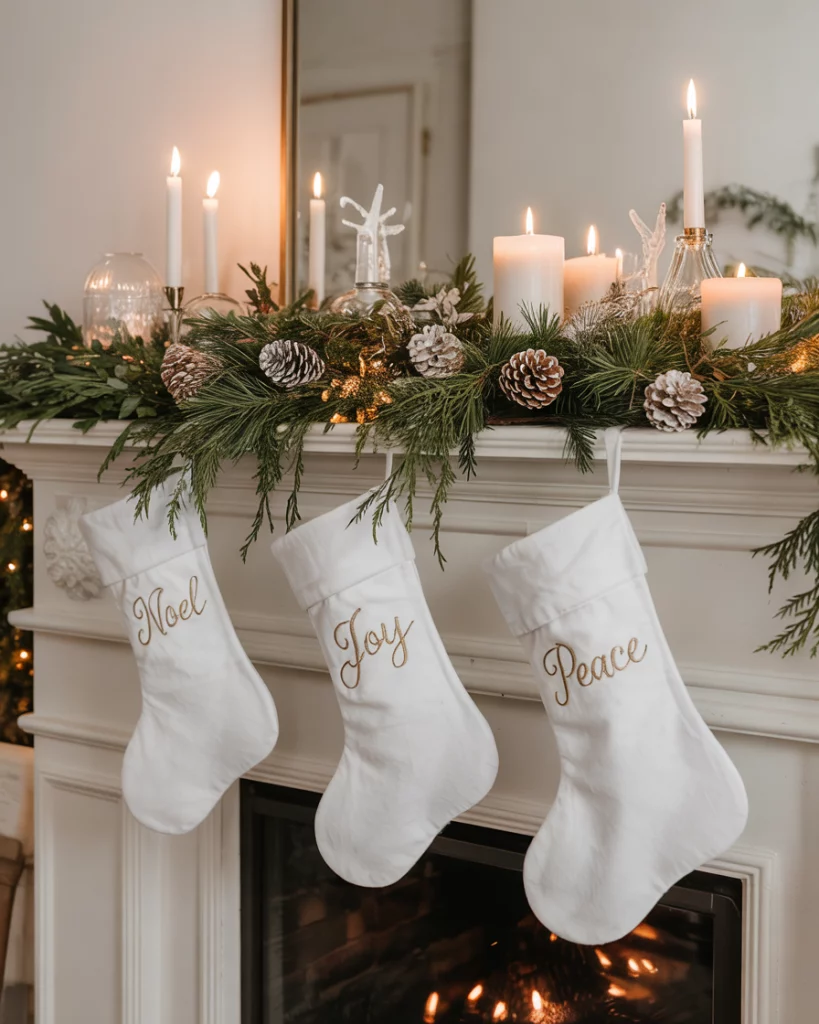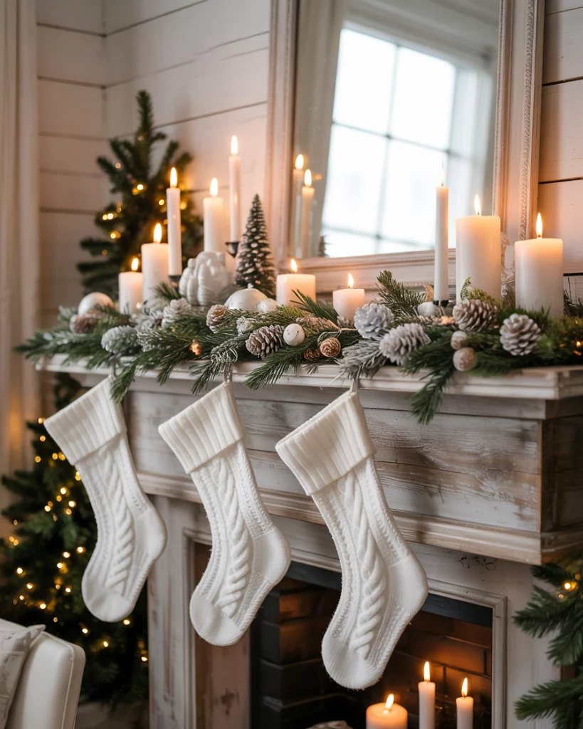 A white-on-white ideas mantle appearance provides a simple, calm-down appearance to those who like minimalistic elegance. Make it pretty with white stockings, artificial snow, bleached pinecones and gentle candle light. Add some wooden or gold touches to make it warm. This fashion suits the contemporary farmhouse minimalism lovers.
