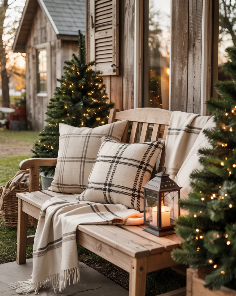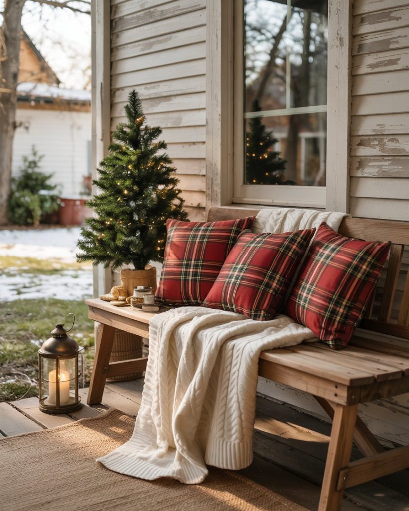 Decorate your exterior bench with overlaps of texture: plaid blankets, large pillows, stacked blankets in a basket. Close by, add a lantern or small tree and you have a Pinterest ready front porches nook that is festive and functional. Perfect to drink a cup of cocoa in the cold mornings.