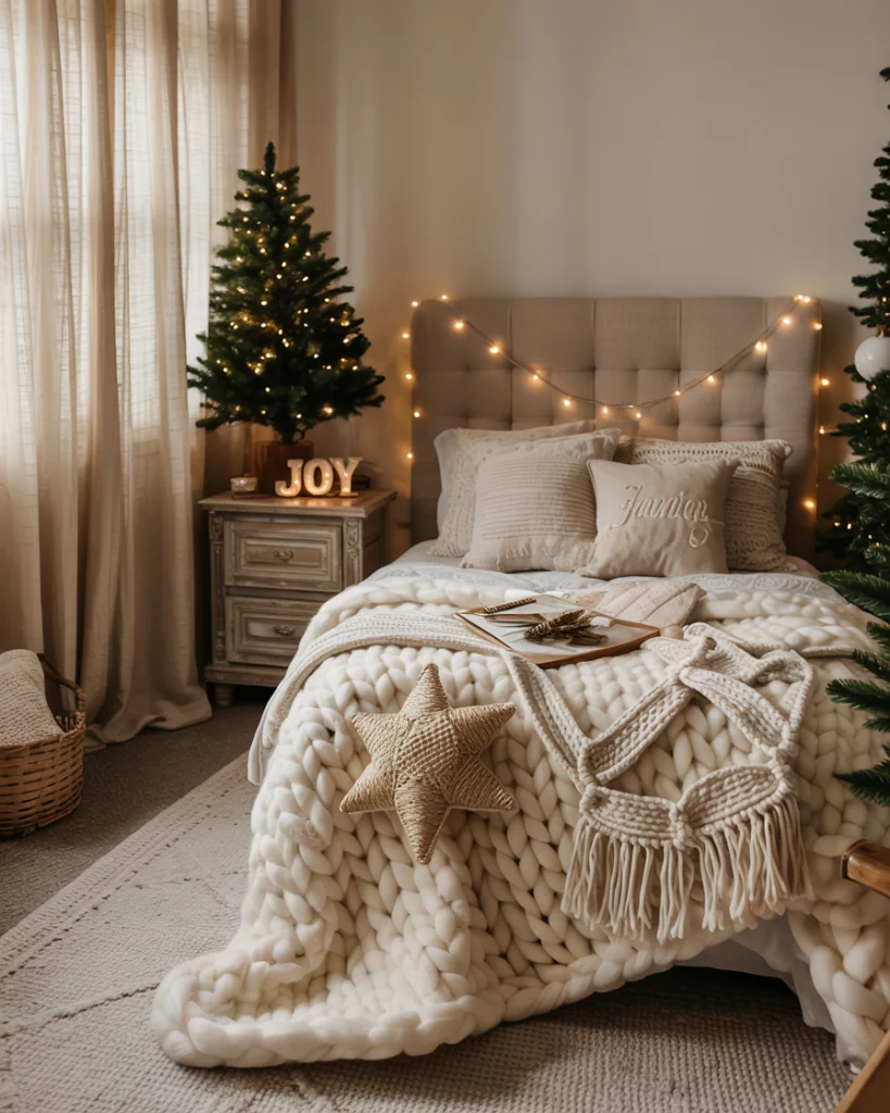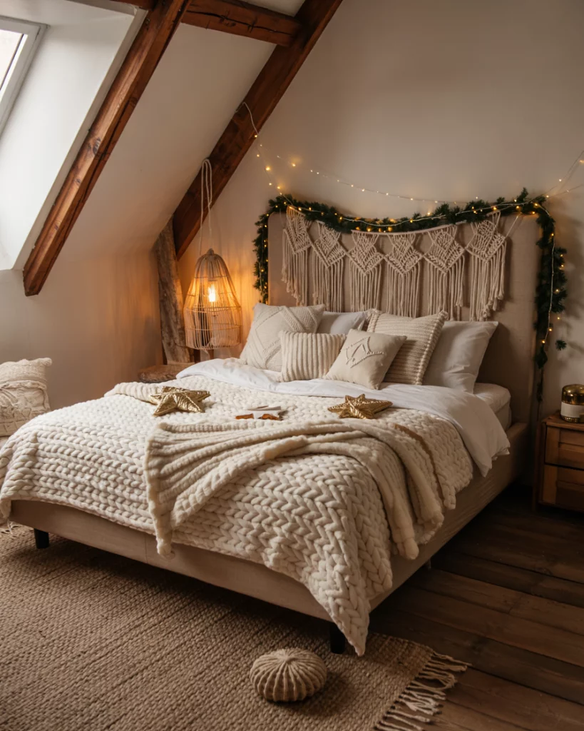 combine boho textures with traditional farmhouse material- consider macramé stars, woven stars, and a natural color scheme. Pile bed on with thick knits and string lights on top. It is a more original concept that anyone who is in need of a more casual, home-style Christmas atmosphere, but is not overly occupied and loud.