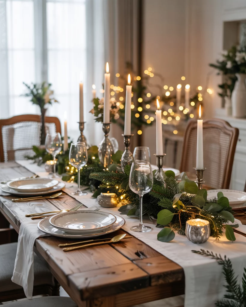 This style was inspired by the French countryside homes and it incorporates distressed wood, old candlesticks, and white ceramic dinnerware. Dress your table in natural linens, eucalyptus branches and taper candles with vintage holders around Christmas. It is grace without pomp- plain, old fashioned and lovely.