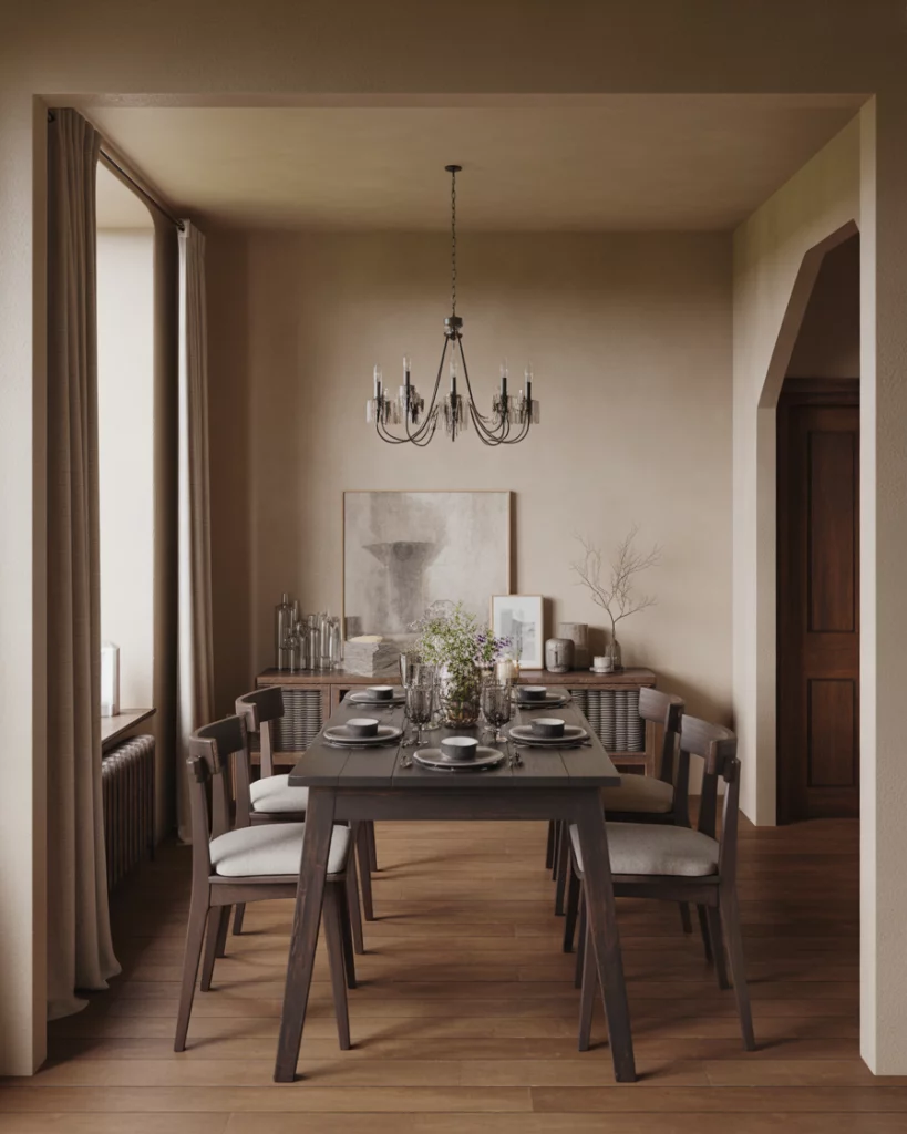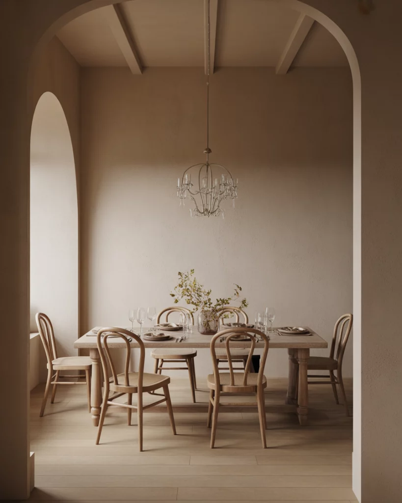 Elements of French country style are subtly shaping farmhouse interiors again, especially in dining and transitional spaces. Curved furniture, soft finishes, and a slightly classy sensibility elevate the look without losing comfort. Paired with farmhouse basics, this influence feels romantic but still livable. Designers often suggest introducing French country elements through furniture rather than decor. This keeps the space from feeling themed. It’s an approach that works particularly well in older American homes with traditional proportions.