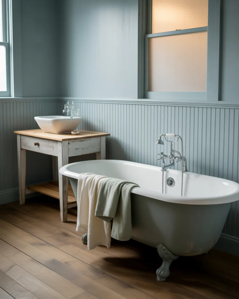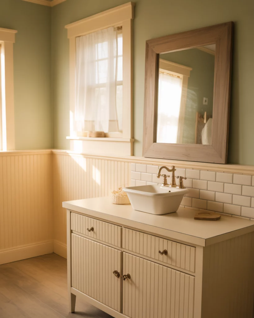 Soft cottage influences are reshaping farmhouse bathroom design. Gentle colors, beadboard, and vintage-style fixtures feel comforting rather than outdated. These bathrooms focus on charm and ease, especially in guest spaces or secondary baths. Budget-wise, this look is approachable because it relies on finishes rather than major renovations. Swapping hardware or lighting can shift the mood significantly. Homeowners often start small and build over time.