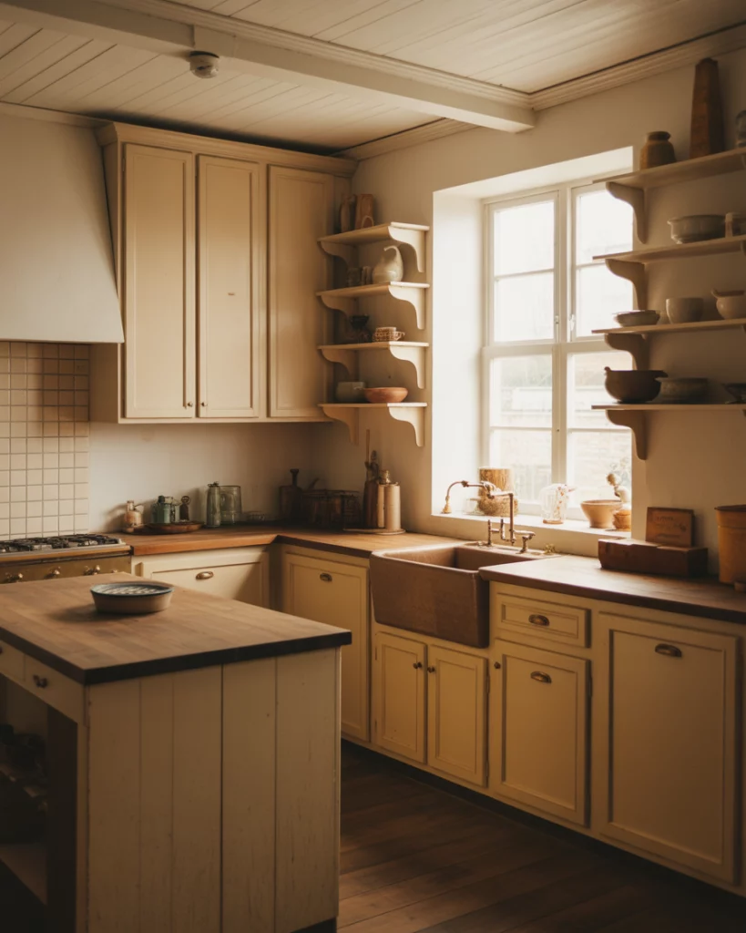 In 2026 farmhouse kitchen design once again embraces the vintage style but in more subtle ways. Rather than themed decor, homeowners incorporate time-worn finishes, patinated metals, and soft cream cabinetry. Antique details added through lighting and hardware give the kitchen depth without feeling staged. The aim is warmth that feels earned. One mistake to avoid is combining too many vintage eras, as that can give the kitchen a cluttered feel. In most cases, homeowners regret the amount of open shelving added, so integrating balance through closed storage helps the kitchen feel calm and practical.
