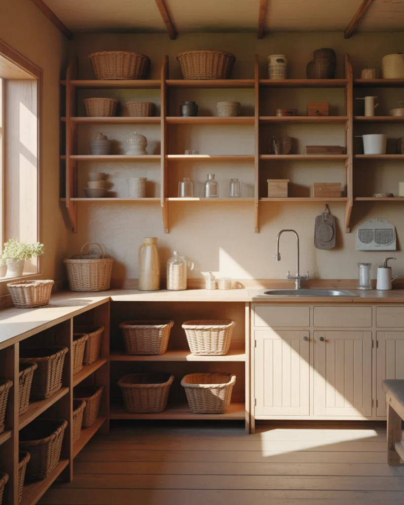 Utility spaces are no longer overlooked, and primitive farmhouse design is shaping laundry rooms and mudrooms in 2026. Open shelving, honest materials, and straightforward layouts embrace function first. The aesthetic feels grounded and durable, turning everyday chores into calmer routines instead of rushed tasks. Real homeowner behavior shows these rooms work best when storage is visible and accessible. Hiding everything behind doors often leads to clutter elsewhere. Keeping essentials within reach encourages better organization and makes the space easier to maintain long-term.