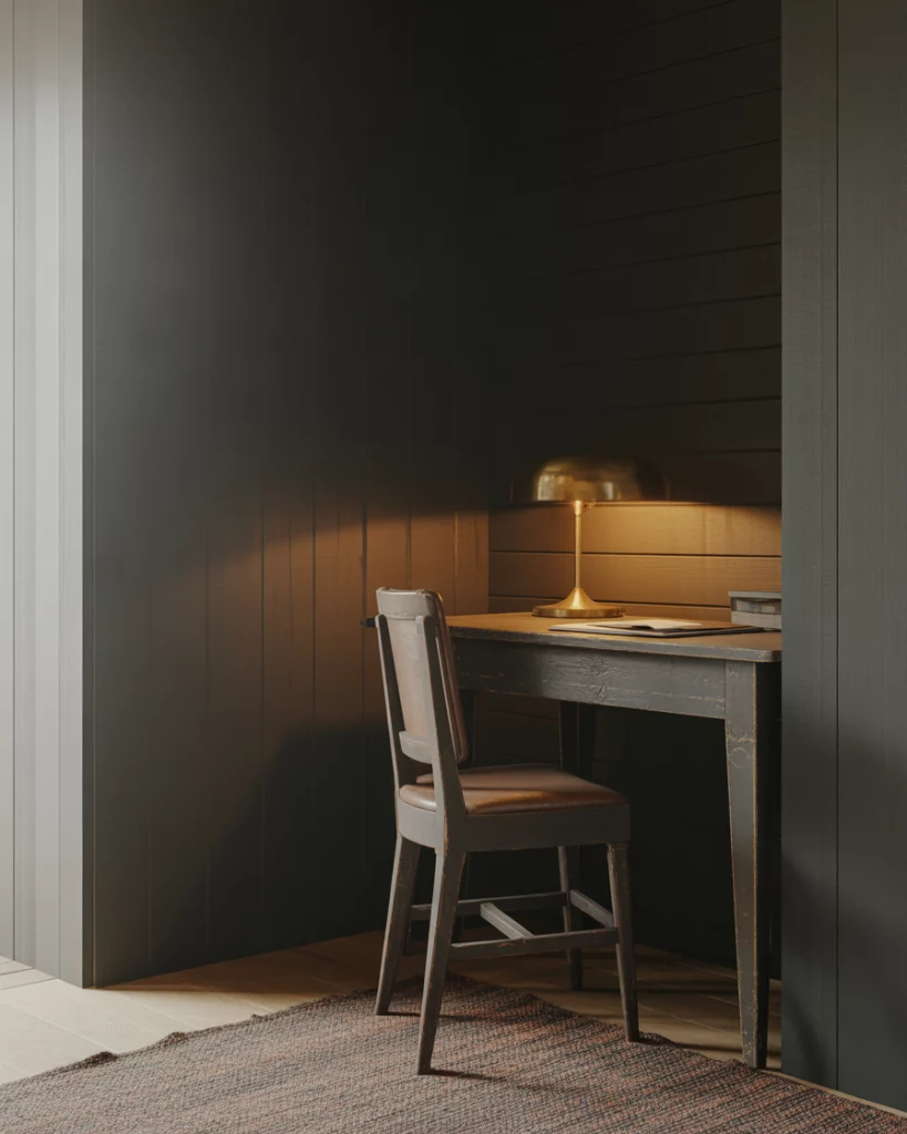 Not all farmhouse spaces are staying light. In 2026, dark and moody farmhouse corners are gaining traction, especially in offices and reading nooks. Deep paint colors, aged woods, and soft lighting add intimacy while still feeling grounded. It’s a bold contrast to the all-white era. A common mistake is going dark without enough texture. Matte walls paired with flat furniture can feel heavy. Layering wood, textiles, and warm lighting prevents the space from feeling closed in.