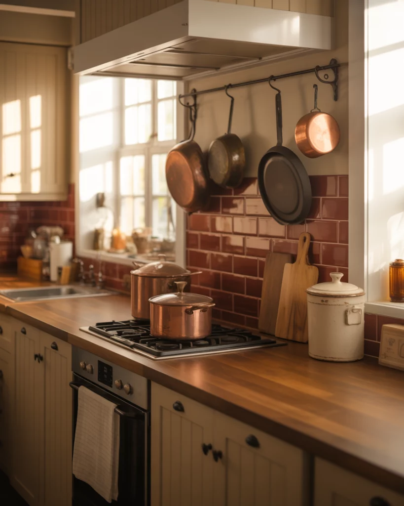 The mix of Industrial and farmhouse styles continues to gain traction, especially through exposed materials. A rough Brick backsplash, matte metal accents, and simple design lines give the kitchen a slightly urban edge while preserving warmth. A practical insight here is restraint. Limiting industrial elements to one or two surfaces prevents the space from feeling cold and keeps the farmhouse character intact.