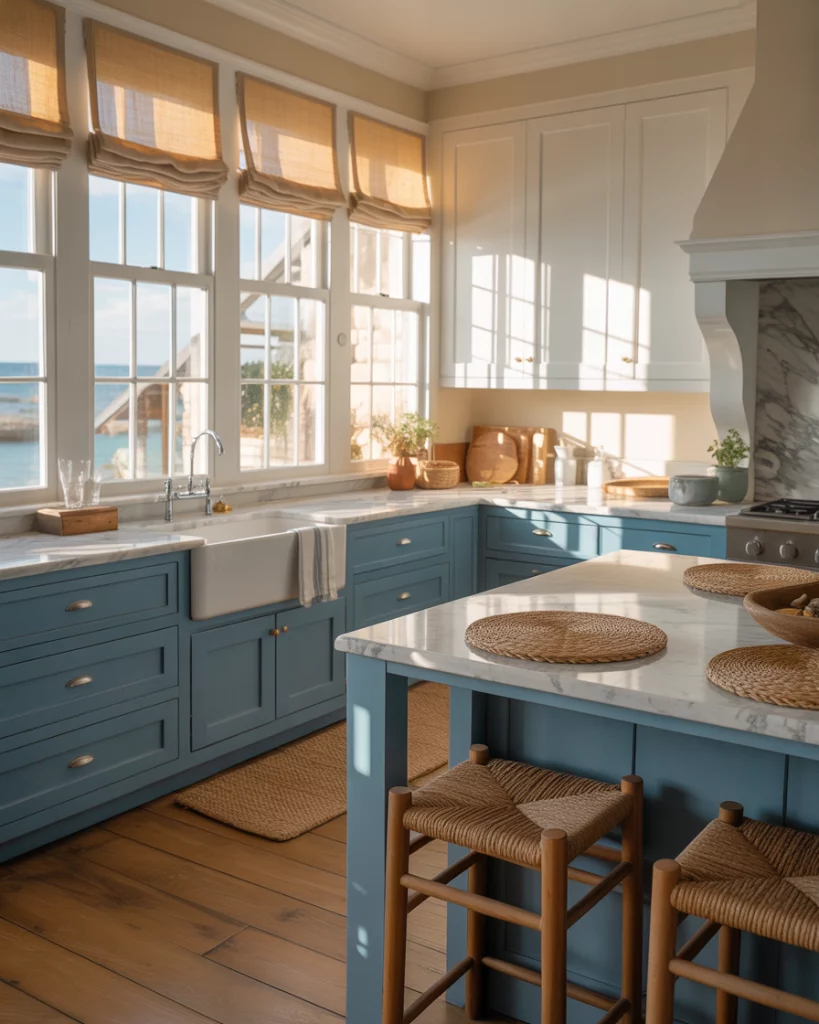 Blending farmhouse comfort with breezy influences, Coastal kitchens feel especially right in 2026. Layers of Blue and White reflect light beautifully, making them popular during a remodel aimed at opening up older homes. The look is fresh but still grounded. From a budget standpoint, paint and lighting changes often deliver the biggest impact here. Homeowners are skipping full renovations and instead refreshing cabinets and fixtures to achieve that coastal brightness for far less.