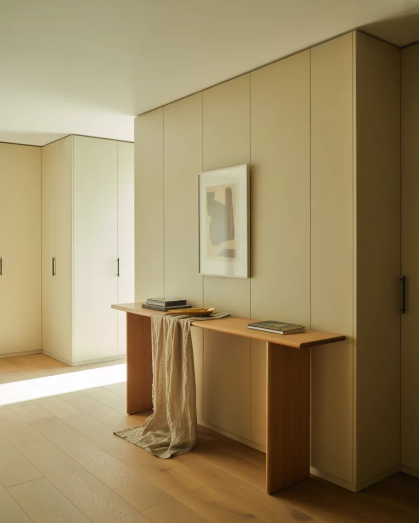 A modern foyer in 2026 with look more calm, intentional, and uncluttered than most. Set the tone with the first piece a clean lined, neutral, uncluttered with soft textures to warm the space. In homes that have a lot of light and great proportions, this will work best. In homes that are more recently built, or recently built and renovated, the overall aesthetics of the space will do all the heavy lifting. Add one sculptural detail to make the space feel less cold and more welcoming. When designed well, this space shines with a good overall cabinet design. The practical design of this space is in the overall cabinet design. When designed well, this space shines with an thoughtful overall cabinet design. This cabinet design will give enough room for a shallow shoe cabinet and a few daily used items to make the rest of the space clean and uncluttered. A surface is also a great option to give some visual space and let a set of keys be easily visible. Over furnishing is the mistake in design that most homeowners make, and it truly distills down to the misuse of one console piece. One console piece with a nice focal object is more than enough to provide enough visual space for the architecture to be focus and truly shine.