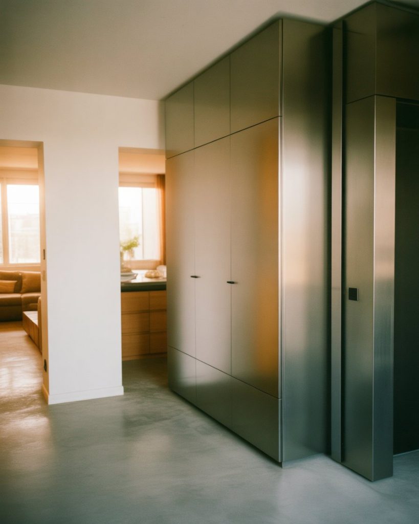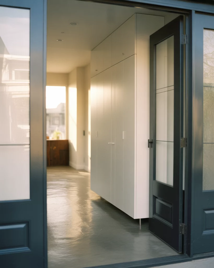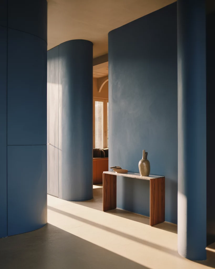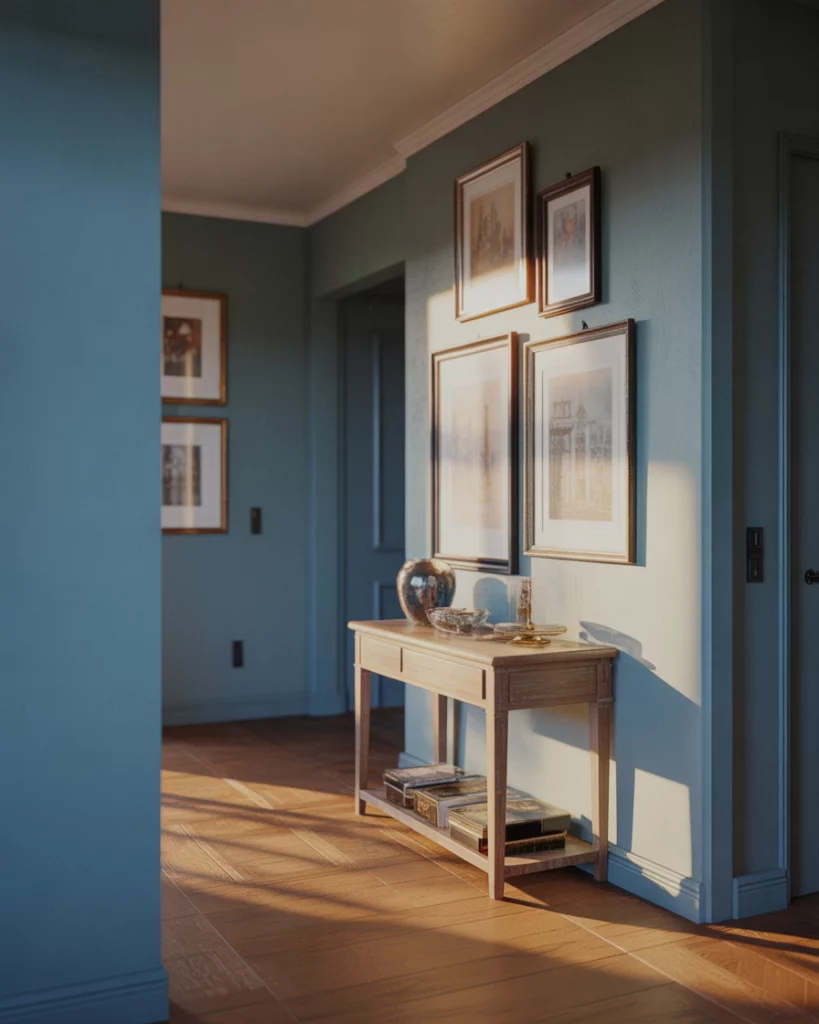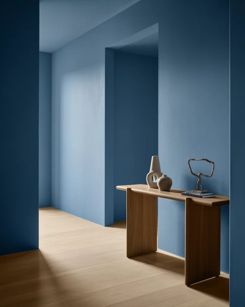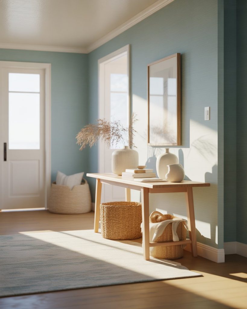A blue foyer feels grounded and calm. In a contemporary setting, cool tones paired with clean lines and minimal decor create a composed entry that transitions smoothly into open-plan living. This color choice suits urban condos especially well, where visual calm helps offset busy surroundings outside the door.