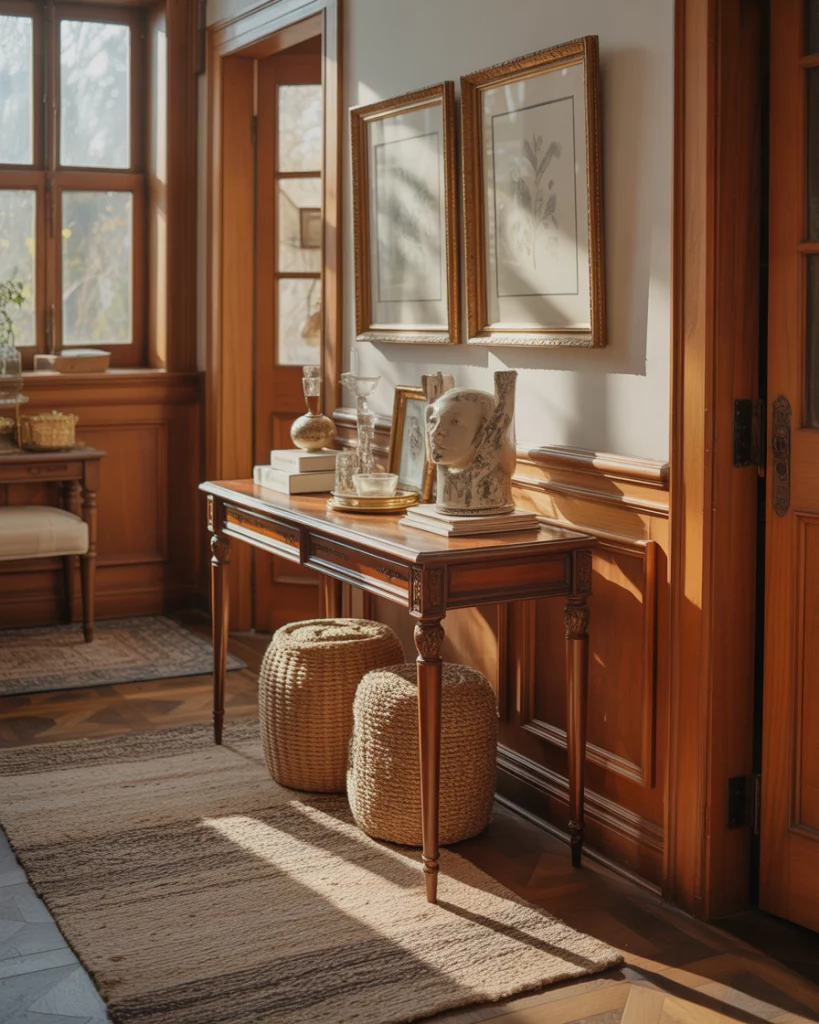 Using vintage elements to create a foyer is a great way to add character to your home. A well-aged table, layered decor, and a mix of antique furniture can make the space feel like it was put together over time and suit your home if you enjoy history. This style works best when individual elements are changed out thoughtfully. A large number of antiques can create a space that feels overwhelming, while a small number of meaningful pieces can add depth and character to the space.