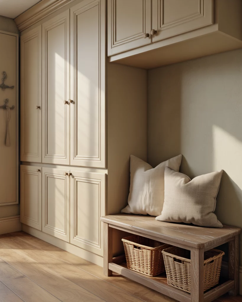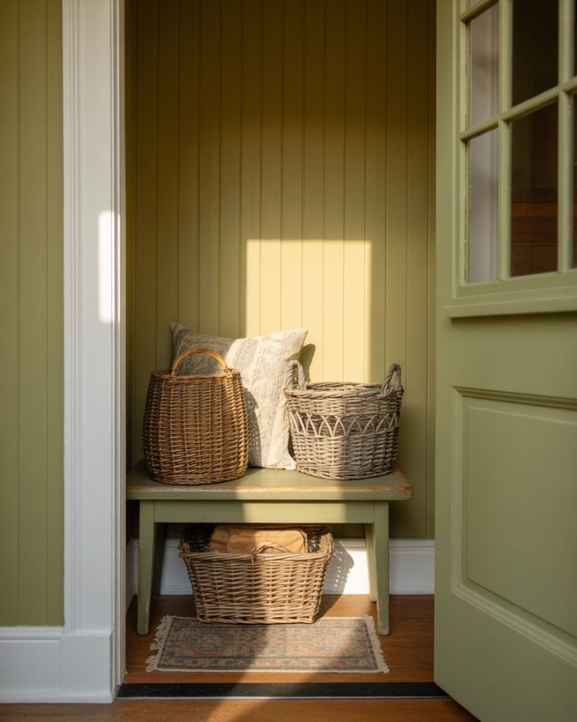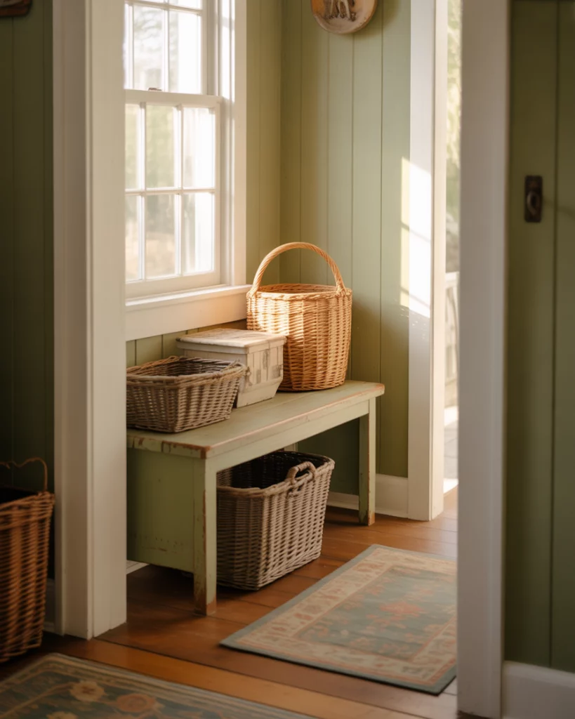 A cozy cottage foyer brings warmth back into the entryway. Think painted wood details, a welcoming bench, and gentle color like sage green paired with soft whites. This look feels especially inviting in older homes or suburban houses where charm matters as much as function. Layered textures make the space feel lived-in rather than staged. This style works best in regions with four true seasons, where coming home is a sensory experience. In places like New England or the Midwest, a soft entry eases the transition from outdoors to in, especially during colder months when comfort matters most.