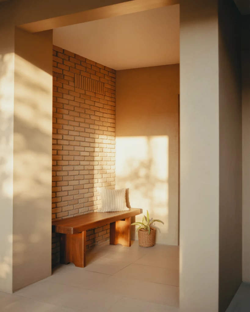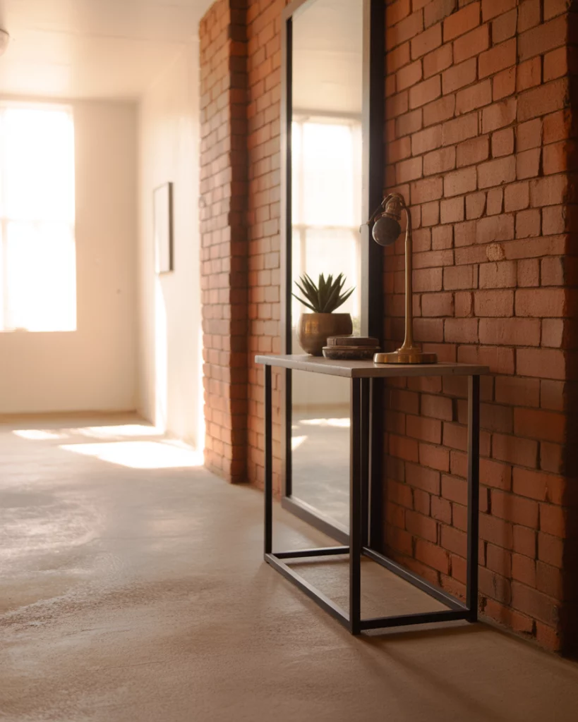 An industrial foyer anchored by a brick backsplash and black accents feels bold yet intentional. Raw textures meet structured lines, creating a strong visual moment right at the door. Paired with restrained decor, the look stays clean rather than harsh. Homeowners often gravitate to this style during remodels because it highlights existing structure. Exposing brick or structural elements can reduce finishing costs while adding built-in character.