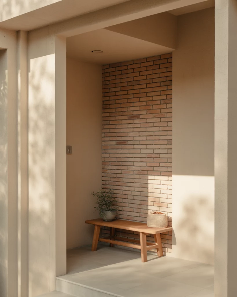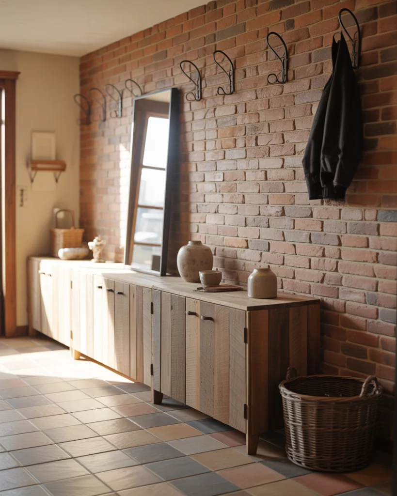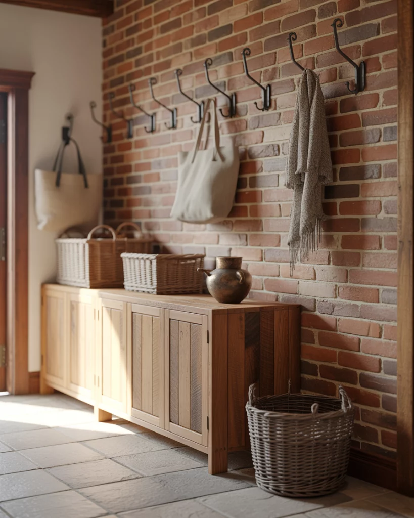 A rustic entry with a brick backsplash brings texture and authenticity right to the front door. Exposed brick paired with simple decor and sturdy cabinets feels grounded and honest. This idea works beautifully in renovated farmhouses or urban lofts where original materials are celebrated. Homeowners often underestimate how durable brick can be in an entry. It handles scuffs, moisture, and wear far better than painted drywall, making it a smart long-term choice for busy households.