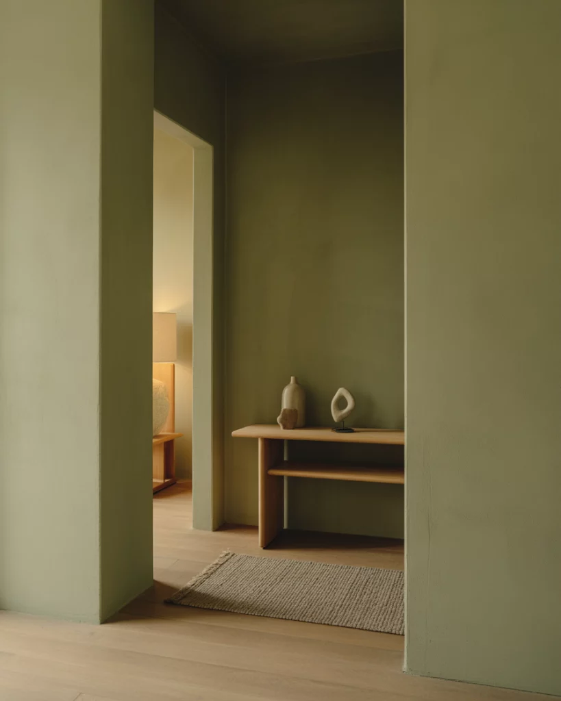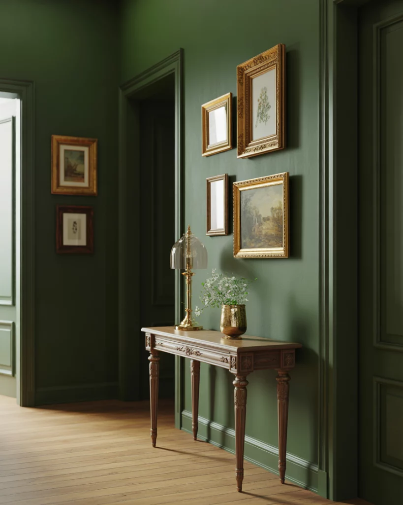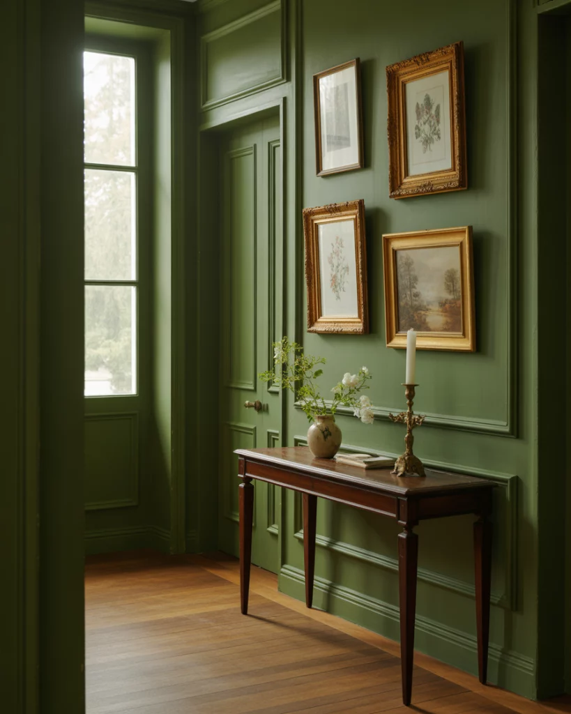 A green foyer inspired by European interiors feels layered and elegant. Deep greens paired with classic decor elements bring richness while remaining approachable. This aesthetic is particularly suited for homes with higher ceilings, as darker colors enhance proportion rather than shrink the space.
