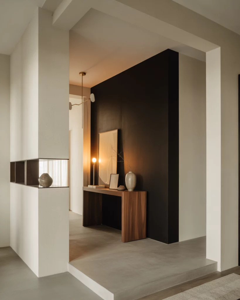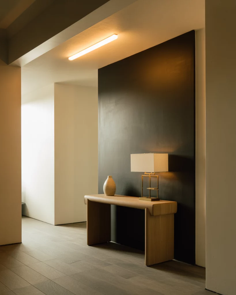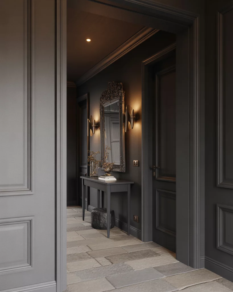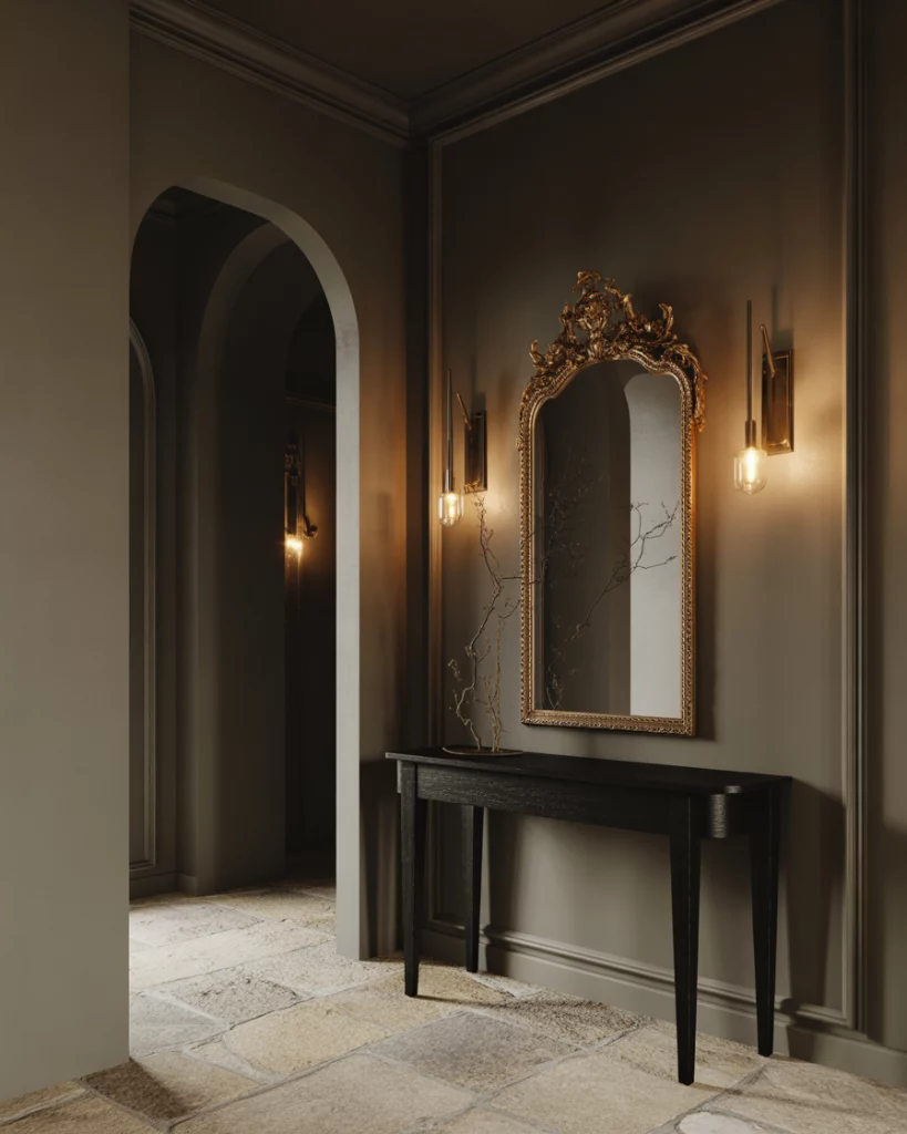 For those craving depth, a moody European-inspired foyer makes a strong first impression. Deep dark tones, dramatic lighting, and rich finishes create instant atmosphere. This approach borrows from historic apartments and modern boutique hotels, turning the entry into a moment rather than a hallway. Designers often recommend anchoring darker foyers with reflective surfaces. Mirrors and subtle metallic accents prevent the space from feeling heavy while preserving the drama homeowners are after.