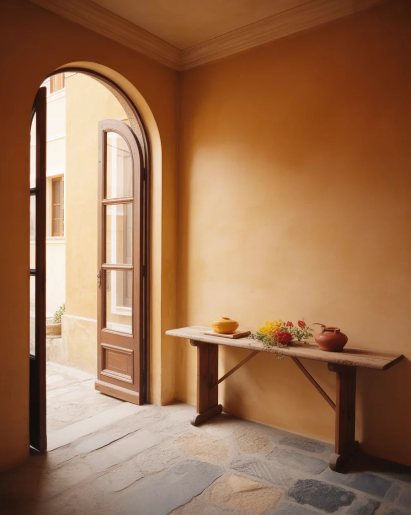 An Italian-inspired foyer taps into warmth, craftsmanship, and understated sophistication. Pairing earthy tones such as red and muted yellow with stone floors and soft arches is timeless. It is the perfect look for homeowners who like old-world character. These entryways tend to be best in warmer places like California or the Southwest where the indoor-outdoor connection and natural materials are nice year-round.