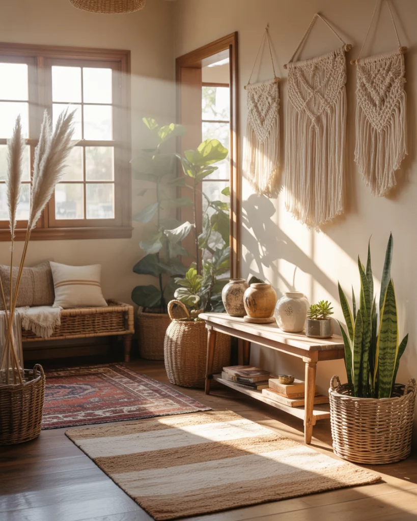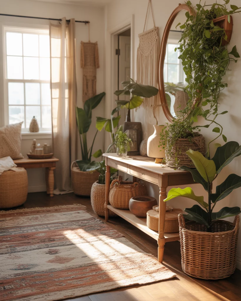 The personality of a boho foyer is a layered look. Layered rugs, expressive green tones, and lots of plants create an atmosphere that feels like an entry that has been collected over time. The approach is easy and favors creativity and the process is simple, and design experts will often remind the average joe to periodically edit boho styled spaces. Adding or switching out accessories and then rotating them keeps the entry free from a clutter feel, and keeps the space in focus.