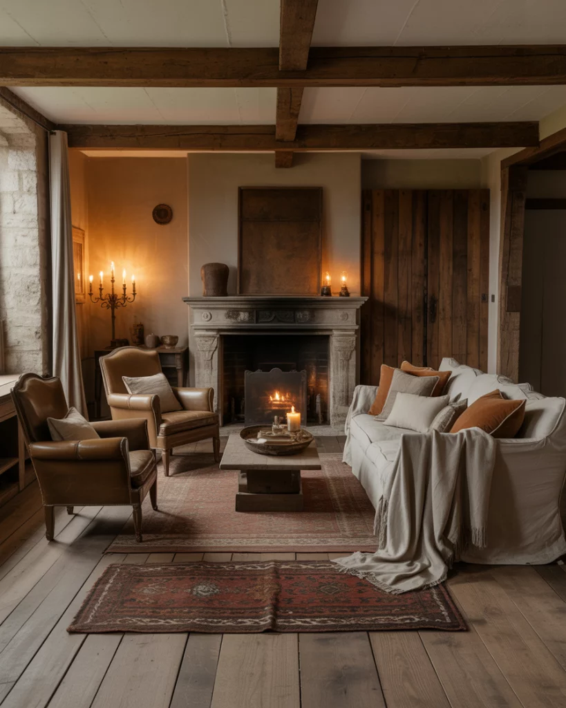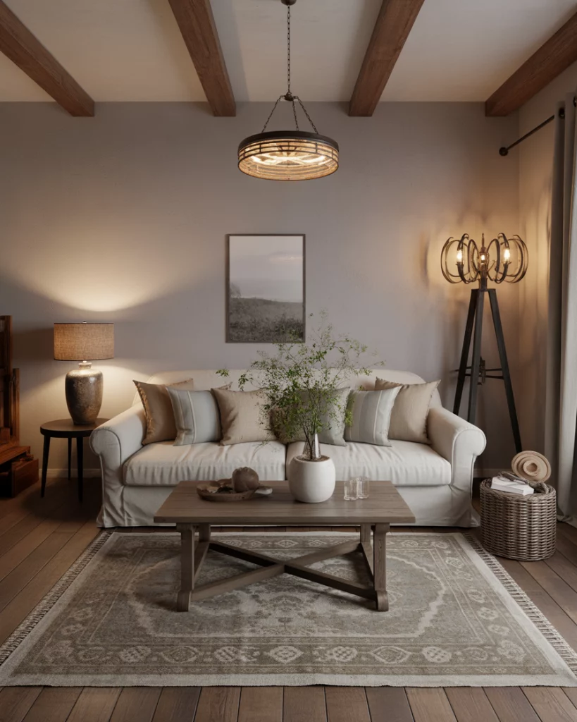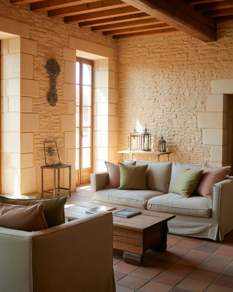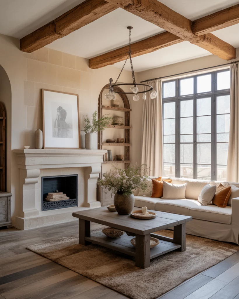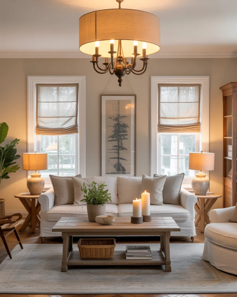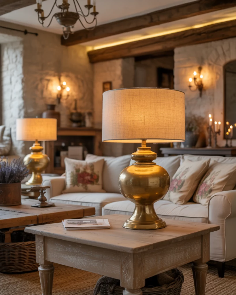 Lighting defines the French country mood, especially when relying on living room table lamps with warm shades. In my own living room, swapping to linen-clad lamps made the space feel instantly more grounded. This idea suits apartment dwellers, too, because it requires no renovation. Layer lamplight with candles and subtle overhead lighting to create that farmhouse glow designers always rave about.