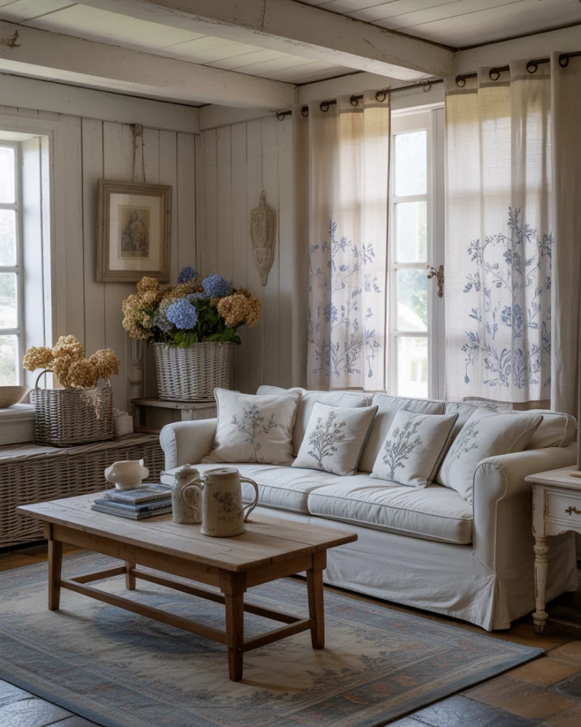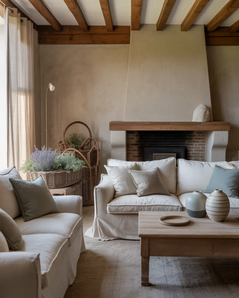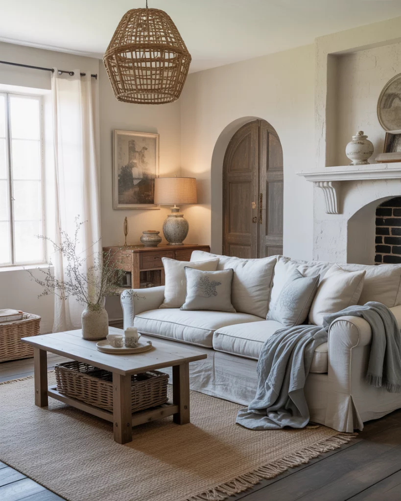 Soft French linens never go out of style, especially in a living room where comfort matters most. In 2026, designers lean into stonewashed neutrals that pair beautifully with rustic textures and subtle blue accents. This look suits an apartment or larger farmhouse setting, especially when layered with throws and slipcovers. It’s a calming style that feels like a slow morning in Provence, perfect for relaxing after work.
