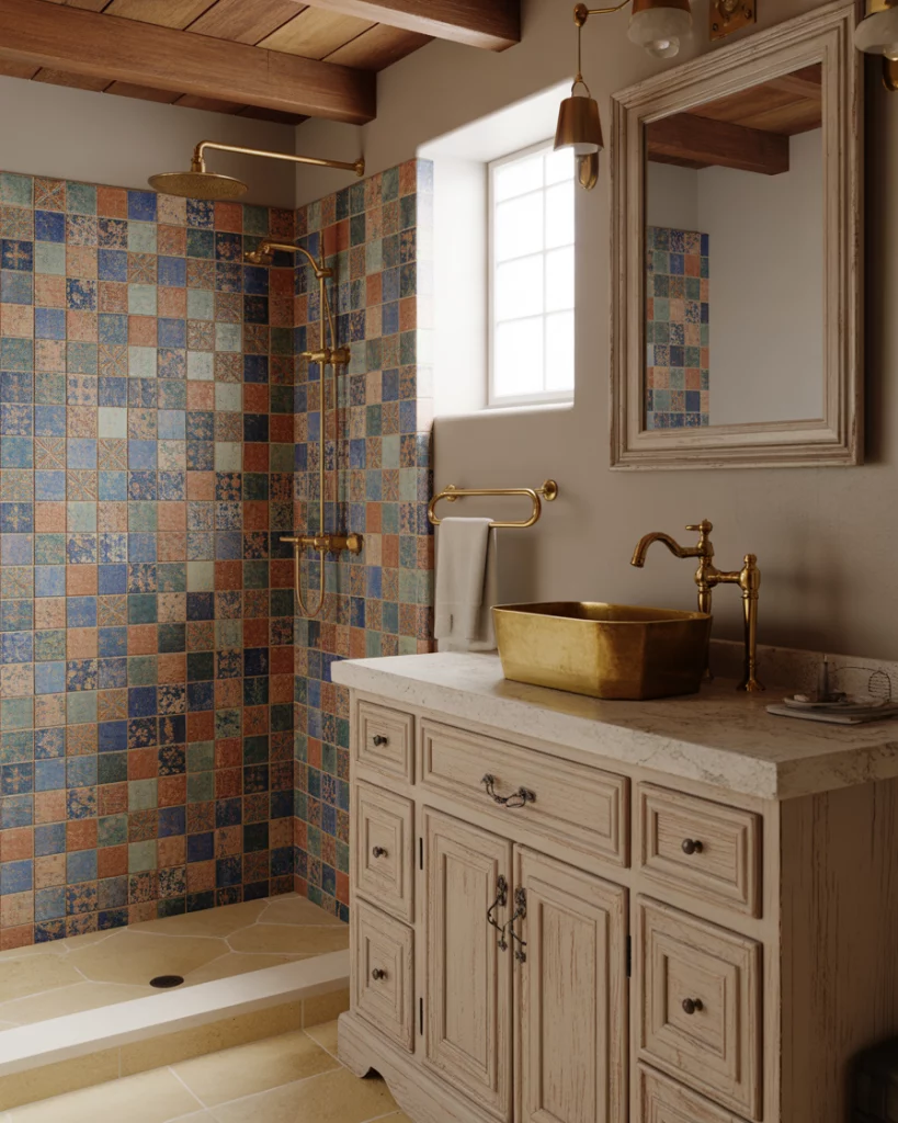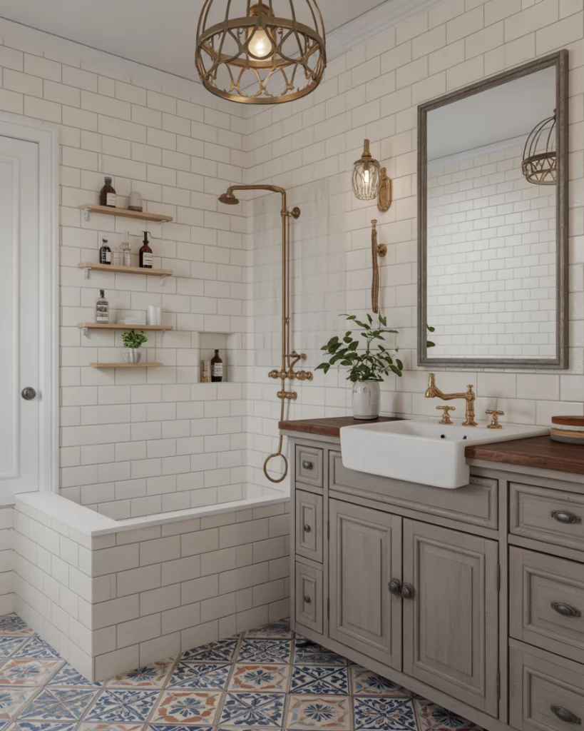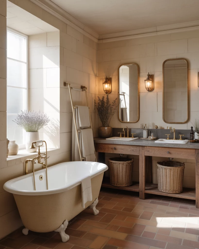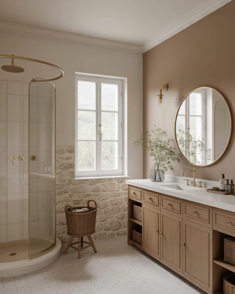 A French-inspired bathroom can balance spa-like calm with historic charm. Homeowners love mixing modern fixtures with antique mirrors and soft stone, creating a space that feels both collected and intentional. This idea works beautifully even in small apartment bathrooms thanks to its light palette. Add aged brass, wicker baskets, and handmade ceramics to echo traditional French market finds.
