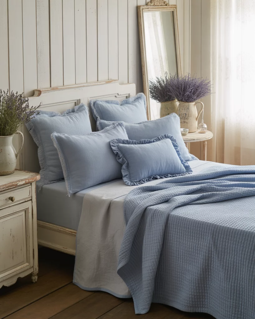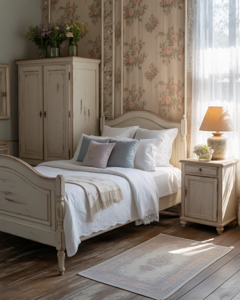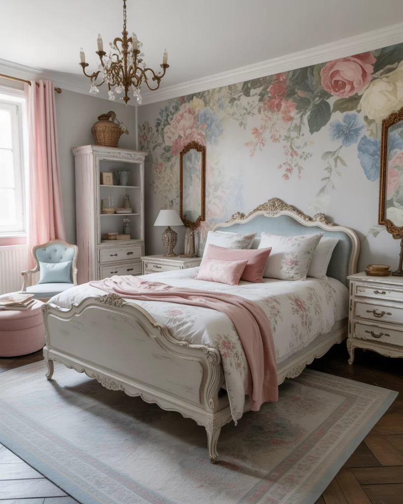 A farmhouse-style shabby chic bedroom approach blends soft nostalgia with fresh, colorful detailing. In 2026, floral textiles, scalloped edges, and distressed white furniture remain popular, especially for creating a breezy cottage feel. This style works beautifully in guest rooms or apartment bedrooms lacking architectural detail. Add soft blue touches for instant French countryside calm.