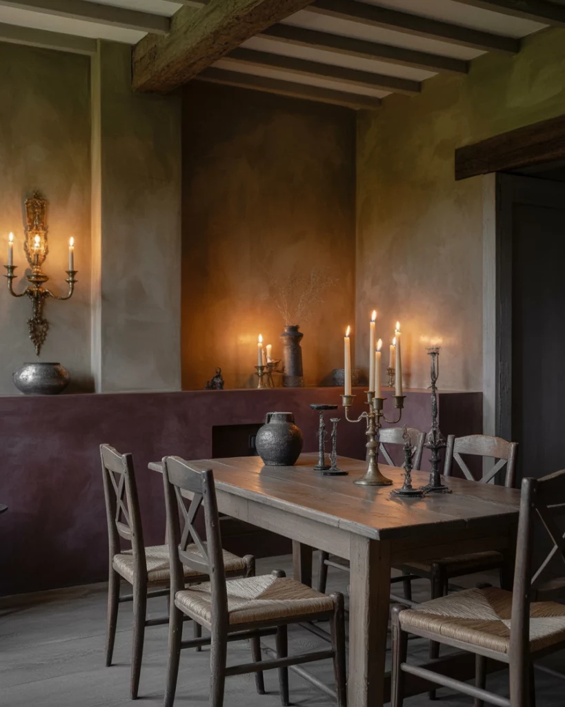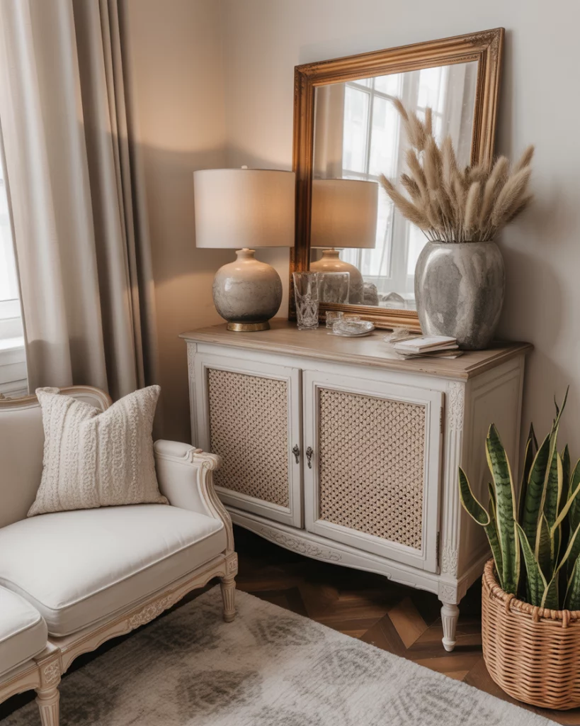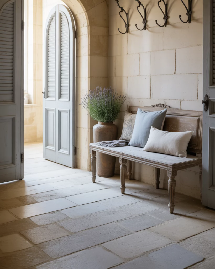 A “moody French country” look sounds contradictory, but in 2026 it’s gaining traction with deeper colors, textured plaster, and candle-lit warmth. It’s ideal for a bathroom, small apartment, or living room where coziness matters. I once saw this style used in a narrow hallway, and the transformation was incredible—suddenly the space felt intimate instead of cramped. Add stoneware, darker textiles, and layered lighting for depth.
