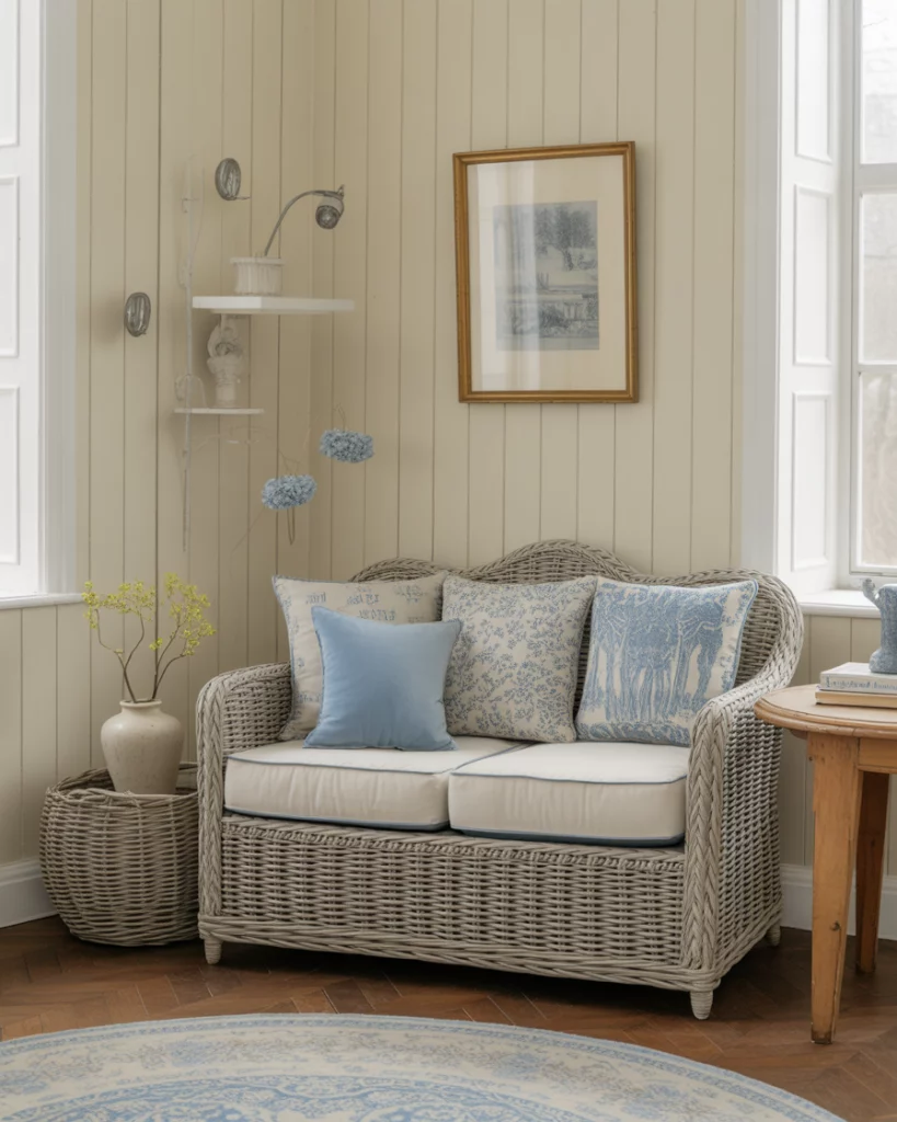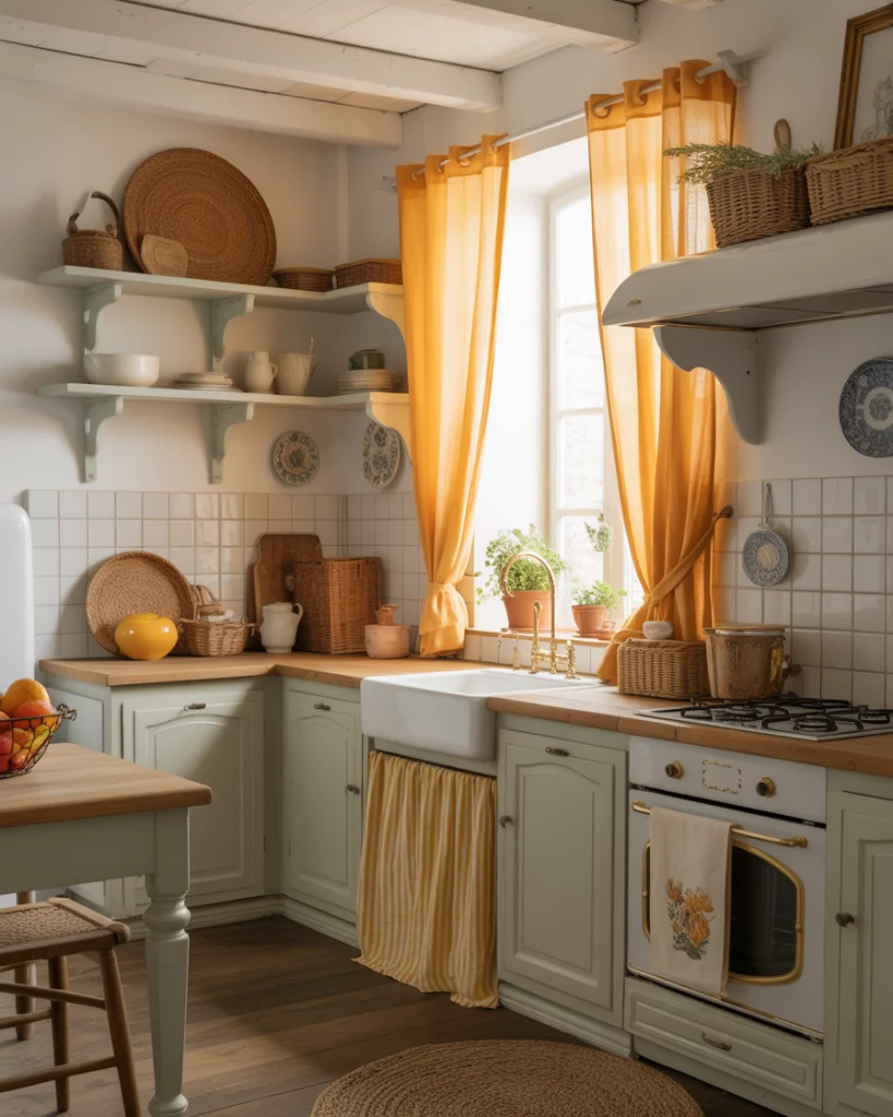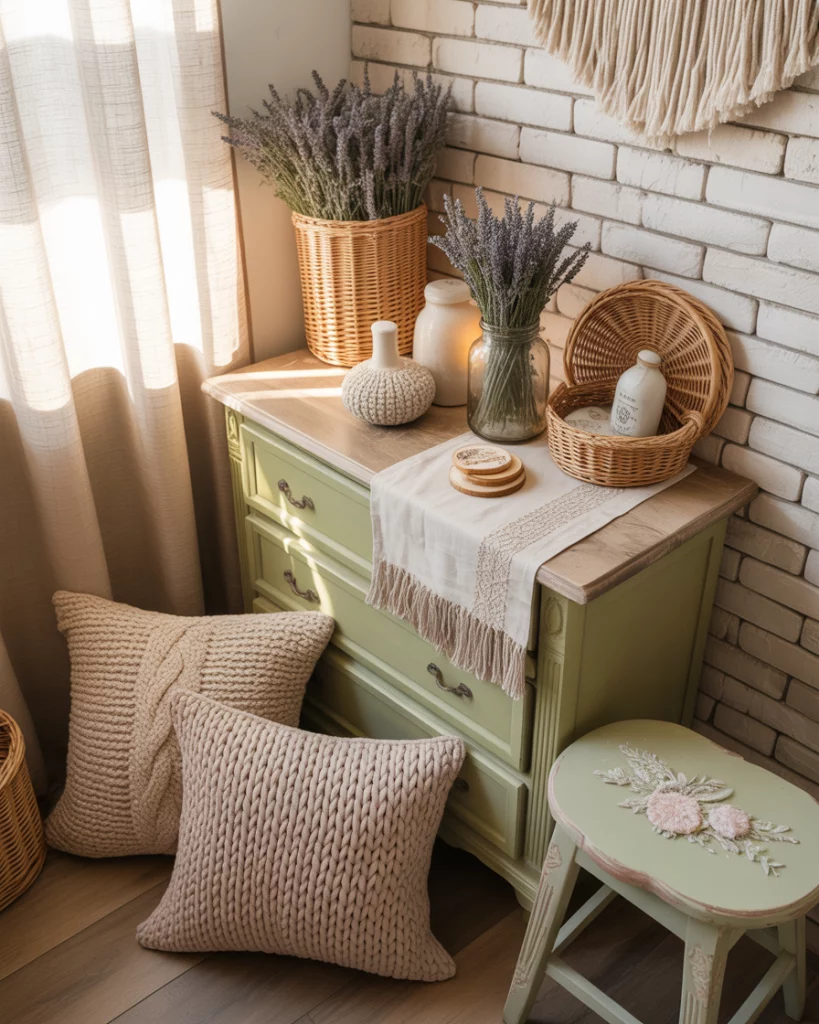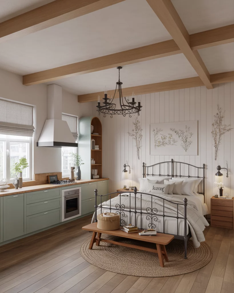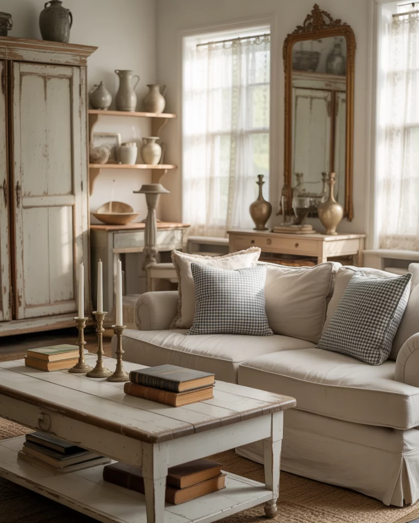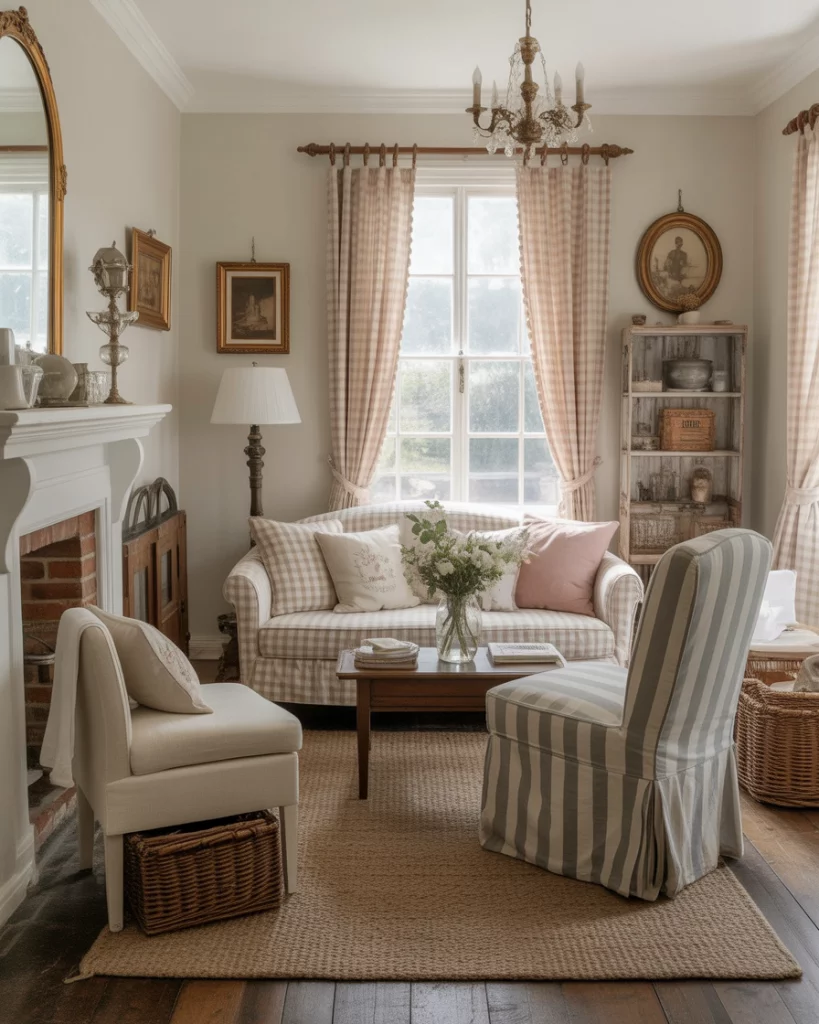 Blending English cottage charm with French country elegance creates a transitional look perfect for living room English cottages or small-scale bedroom farmhouse-style shabby chic designs. I’ve always loved how this approach feels like a storybook home—gingham, antique finds, and weathered baskets set against soft neutrals. It’s ideal if you enjoy mixing traditions and don’t want your home to feel strictly one style.