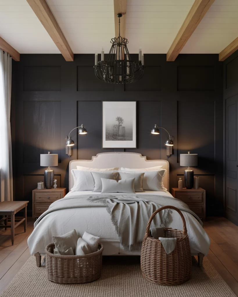 A black and dark wood accent is just one way to create a statement black and white French country bedroom interior design theme for your primary or master bedroom ideas.