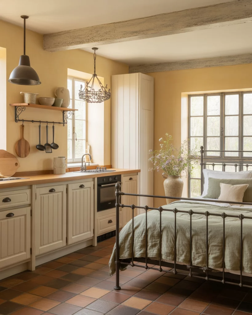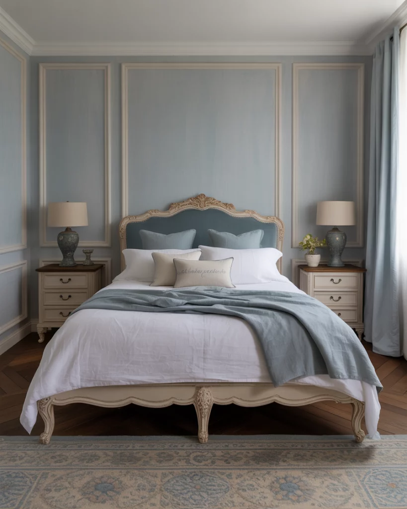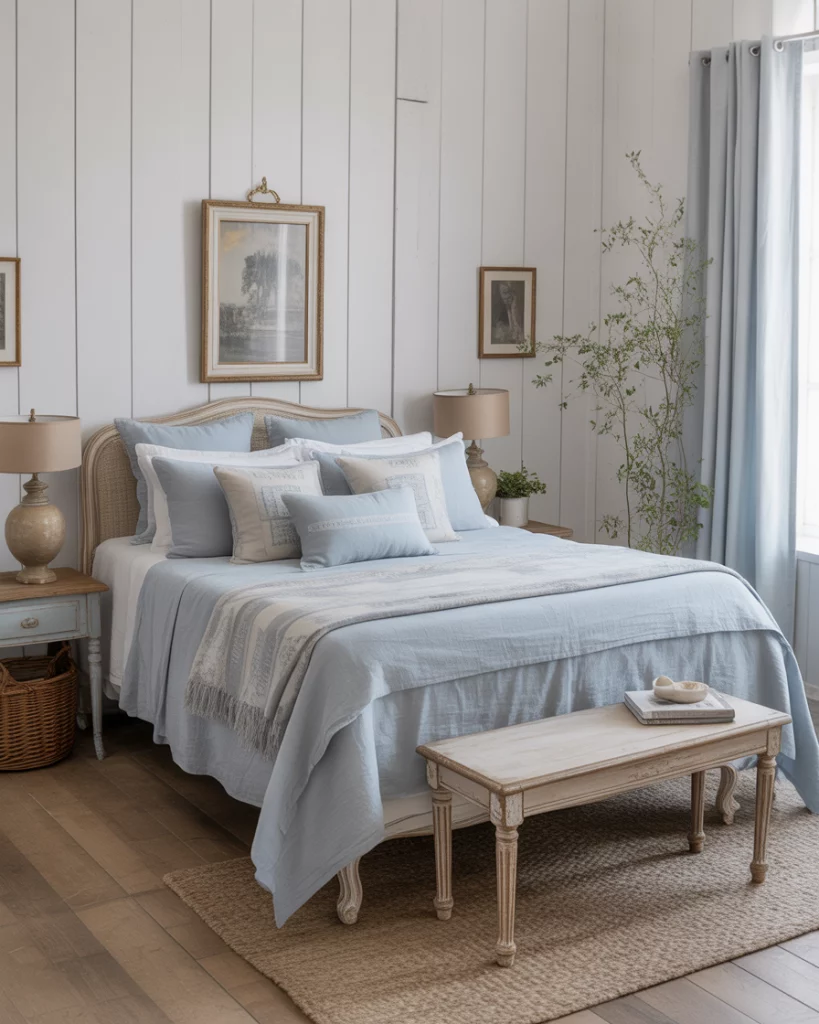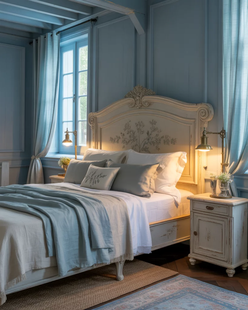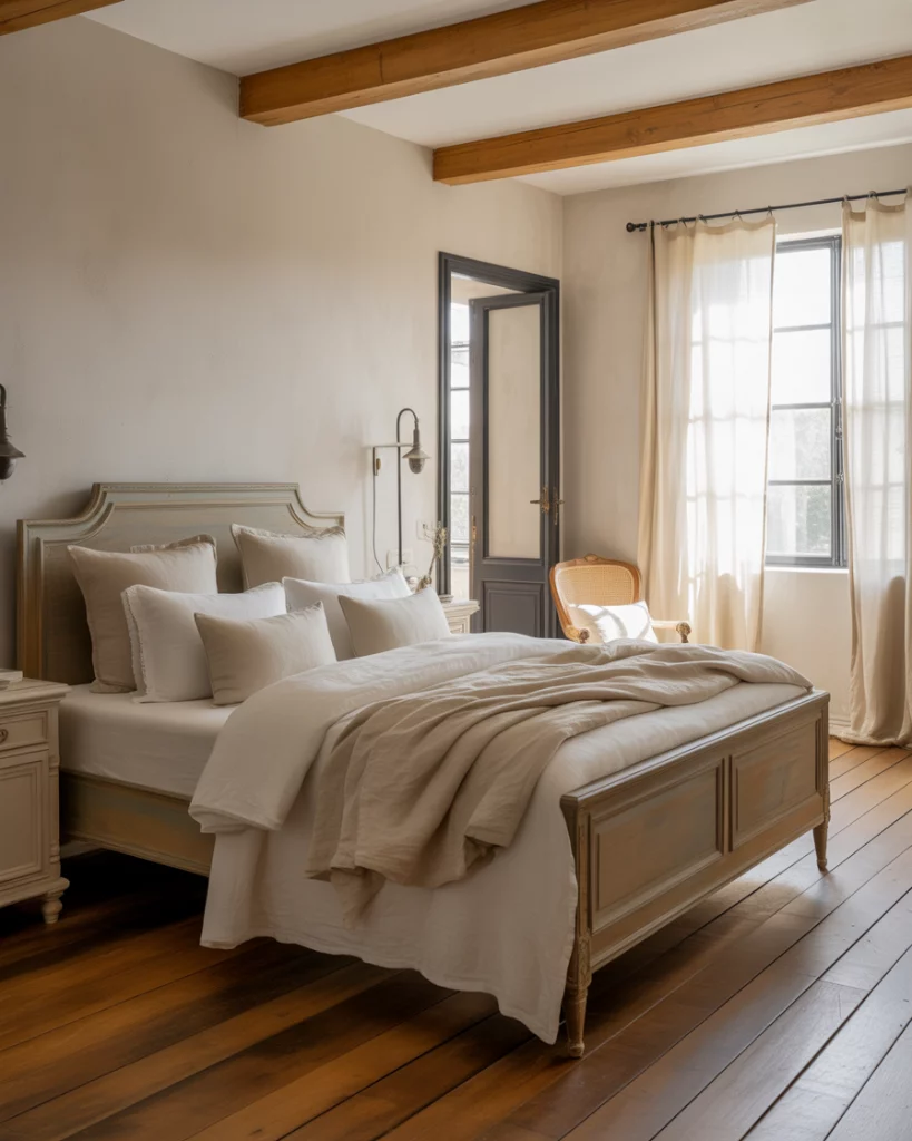 An elegant French country bedroom balances refined textiles with relaxed finishes. Think embroidered coverlets beside raw linens or carved headboards softened with neutral drapery. This idea pairs beautifully with ideas for the soft blue palette trending in 2026. I’ve recommended this to clients needing serenity—within days, they report the room finally “feels like an exhale.”